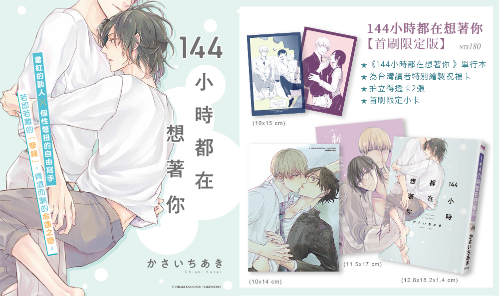 BL漫畫家「かさいちあき」老師,曾出版《沒生氣的話就轉過頭來看我》、《愛戀神樂坂》、《戀、性和魔法的作用》、《拜託了 Melty劇院》…等作品,深深受到讀者的喜愛。新作《144小時都在想著你》描述當紅的藝人和個性彆扭的自由寫手每週一次的祕密約定,從高中時為了安慰心情低落的清司才順勢而為的舉動,之後更用了「性慾處理」這種膚淺的理由來當藉口,好繼續維持自己對清司這份一見鐘情的感情。每個禮拜四的24小時,久久才能見一次面的寂寞讓清司的一舉一動更顯可愛,也讓籠目愛戀的心意日益加深。雖然因為害怕破壞現況而一直隱瞞心意無法告白,但胸口滿溢的愛意已經越來越無法遏止——。