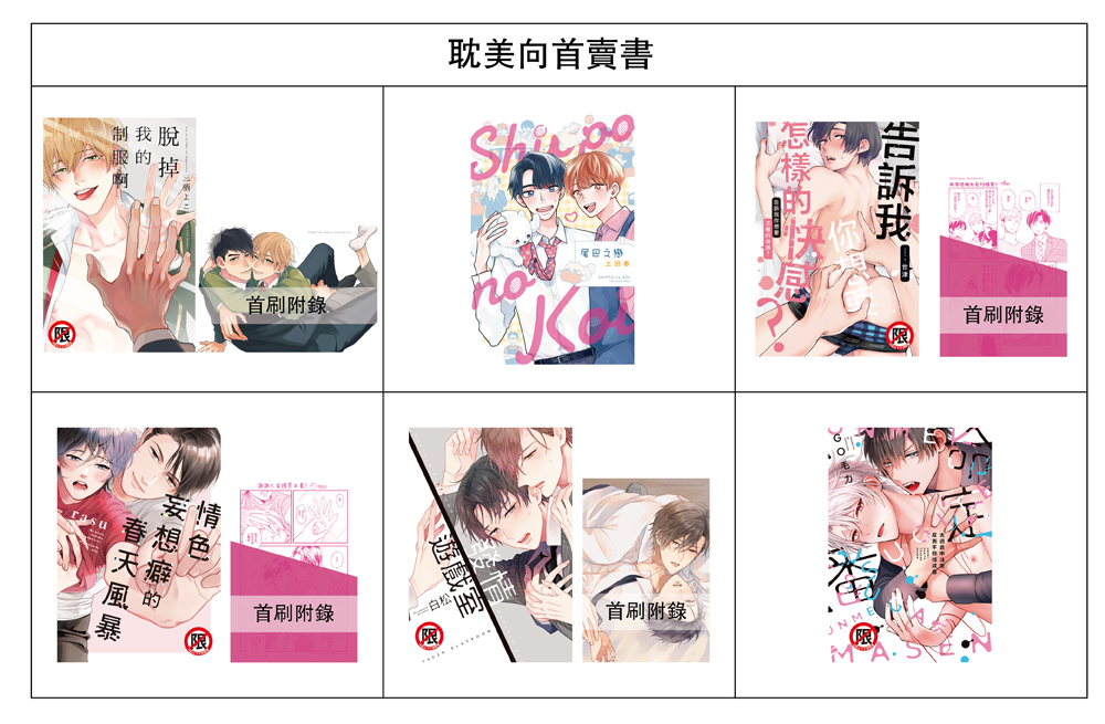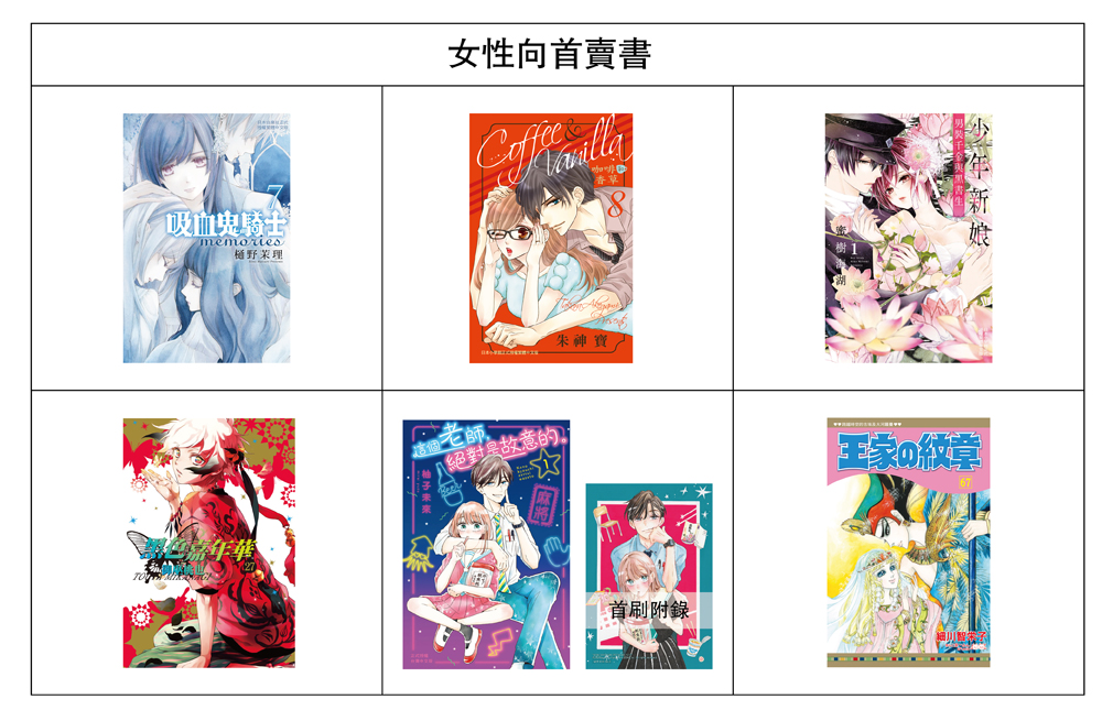 本次女性向首賣書總共有6部新作:日本超人氣樋野茉理經典作品《吸血鬼騎士 memories》(7) 在優姬成為「叛徒」、愛當上「女王」之後,她們各自所面對的考驗又將會...?!朱神寶《Coffee & Vanilla 咖啡和香草》(8) 深見先生的母親突然來訪!他那麼厭惡母親的理由究竟是?蜜樹海湖新作《少年新娘─男裝千金與黑書生─》(1)美貌書生×男裝千金跨越命運,只為抵達幸福──!以上三部作品將於本次動漫節推出限定特裝版。