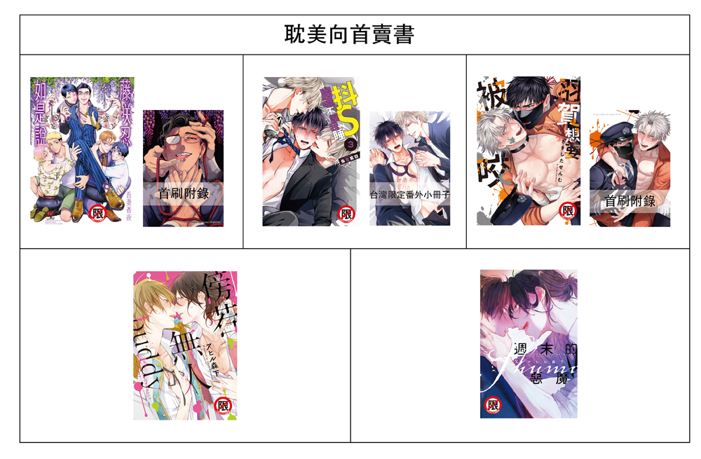 本次動漫節耽美向首賣書將推出多部超人氣作品,由吾妻香夜帶來的新作品《藤咲忍如是說》實力派演員病嬌S•八坂×幹練商人兼究極抖M的變態紳士•藤咲25年前的初戀修成正果!朱鷺紫羽人氣作品續集《抖S幽魂不讓我睡》(3)限定版 抖S幽靈高中生×(被開發的)倔強處男上班族的超人氣BL,眾所期待的續篇第三彈!さきしたせんむ《羽賀想要被咬》童貞獄警×齒控犯人,用Ω的發情費洛蒙把正直的α獄警迷個神魂顛倒!性慾色彩超濃烈的愛情喜劇!以上三部作品將於本次動漫節推出限定特裝版!アヒル森下新作限定版二連發!《傍若無人buddy》不管是唱歌還是上床,都是跟我一起才是最舒服的吧?實力頂尖的任性新人×不服輸的底層練習生;《週末的惡魔》被如同惡魔一般的抖S逮住的可憐羔羊,他的命運將!?