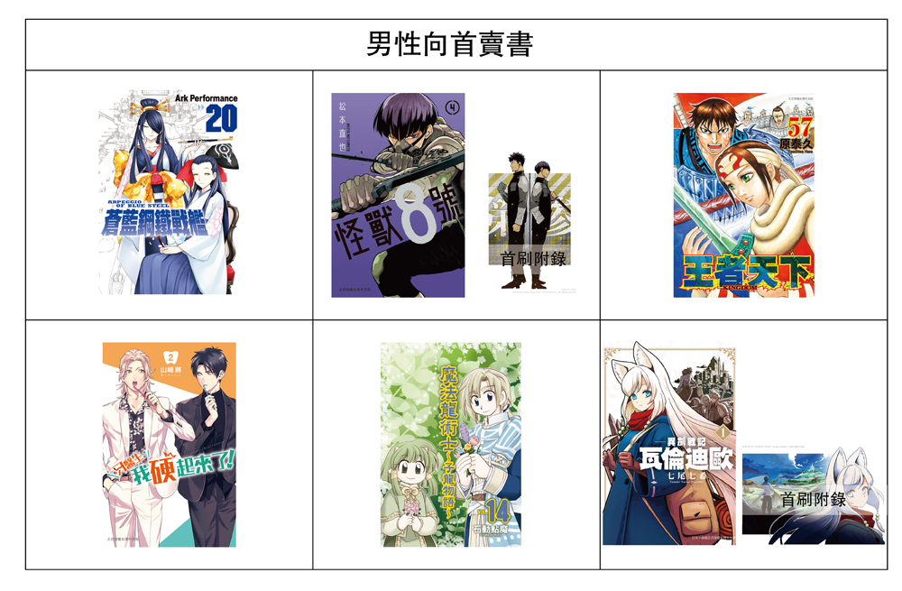 男性向首賣書部分帶來5部人氣作品續集;Ark Performance《蒼藍鋼鐵戰艦》(20)被幽禁在柱島中的群像,獲得了舊型潛艦,決定逃出柱島,海洋上火花四射的第20集!!松本直也超人氣強作《怪獸8號》(4)卡夫卡的抉擇會是──…「威脅」尚未解除的第四集!!原泰久《王者天下》(57) 方中軍生死鬥!第十五天,終於迎向最終戰!山崎將《牙醫生,我硬起來了!》(2)黑墨跟白雪兩人出門約會,卻發生意外,導致兩人的關係越來越複雜!?石動鮎魔《魔法龍術士 ~ 子龍物語 ~》(14)在聽了子龍們各自想做的事情後,馬傑爾的決定是——?