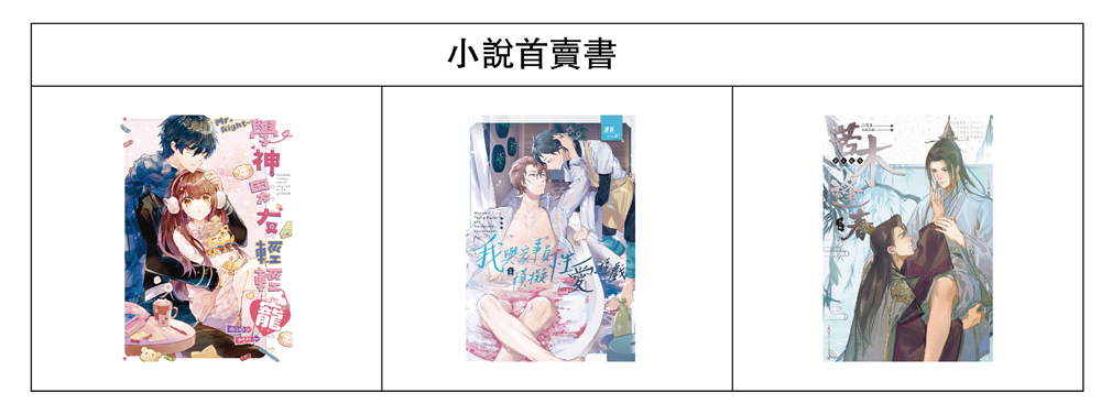 原創小說這次帶來了三部人氣作品;椰子樹《Mr. Right~學神男友輕輕寵》知名文學網站人氣榜作者椰子樹+原創漫畫新人獎金獎得主尹思然,雙新星首度搭檔,比校園偶像劇還逗趣清甜的初戀曲,一起來尋覓專屬的Mr. Right!首刷附贈:「鯉魚?こい?恋!?」雙面彩色明信片;最令人期待的原創小說作品《我與家事員的模擬性愛遊戲》BL小說暢銷作家瀝青+魅男系繪師Jinko_神子,聯手新創誘惑體驗;模擬戀愛的教戰手冊第一條──提「槍」上陣!首刷附贈:「戲水入浴美男圖」雙面海報卡,並將同步推出限定特裝版!人氣小說《松花釀酒》兄弟作!小箐嵐《苦木逢春》硬不起來的王爺×代嫁處子男妃,先婚後愛──搖身一變剛猛夫婿!首刷附贈:「貴氣王爺」、「嬌氣公子」單面彩色書籤卡2入組。