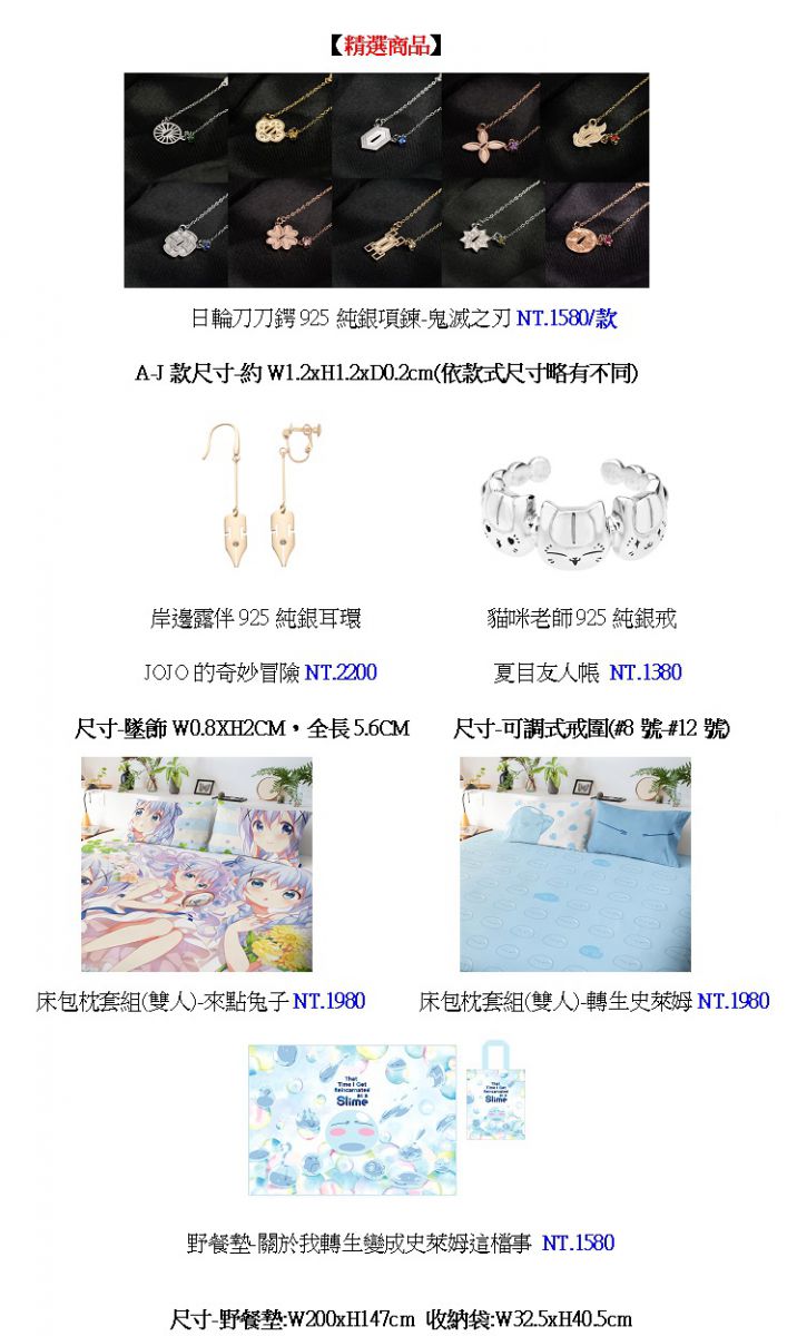 此次更推出多款特色精品級的周邊商品,日方嚴格監製,超高規格製作質感再升級,僅動漫節現場販售!有將經典動漫打造成永恆的純銀飾品,首推薦《鬼滅之刃》 925純銀項鍊搭配角色專屬寶石,日輪刀刀鍔為鬼滅之刃角色象徵,將角色信念戴在身邊吧!還有《JOJO的奇妙冒險 不滅鑽石》,被稱為荒木老師化身的角色,高人氣角色「露伴」華麗的925純銀耳環,精緻的筆尖設計,搭配精緻水鑽,有耳夾款與耳針款兩種選擇,《JOJO》粉絲必收!飾品類還有《夏目友人帳》,將經典角色「貓咪老師」三種可愛的表情化成純銀戒指,帶在身邊天天都有好心情,在新的一年,搭配純銀系列飾品,將喜歡的角色信念化做祝福,送給自己或喜愛的人吧!