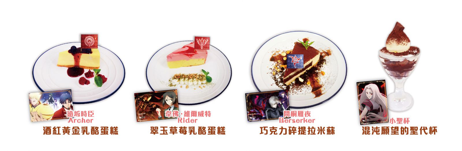 《Fate/Zero》動畫10周年主題Café與MyAnime Café合作,以創意蔬食料理結合各種要素,重新詮釋動漫主題餐點,帶給大家不同於一般主題餐廳的全新食趣,期間限定主餐:Saber陣營雙色咖哩飯、Lancer陣營青醬義大利麵、Assassin陣營麻婆豆腐蓋飯、Caster陣營闇黑花枝素排堡、愛麗絲菲爾與伊利亞母女檔的歐式肉丸佐馬鈴薯泥,甜點類:Berserker陣營巧克力碎提拉米蘇、Rider陣營翠玉草莓乳酪蛋糕、Archer酒紅黃金乳酪蛋糕,更特別提供代表聖杯的混沌願望的聖代杯,另結合16款特調飲品,以精心烹調製作的特色餐飲,全心迎接每位來店的消費者。全店於《Fate/Zero》主題期間以專屬美圖營造獨特的空間及氛圍,讓用餐者都能享受輕沉浸式用餐體驗。