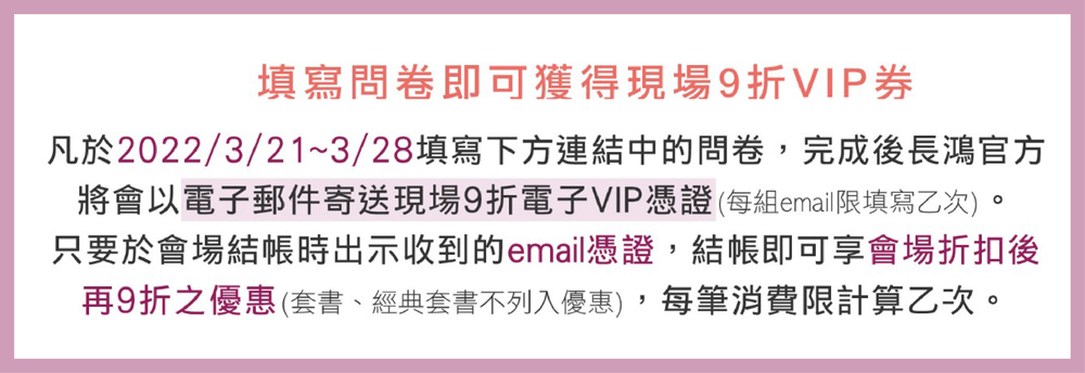 本次限定的問卷活動,在指定的時間內填寫問卷即可享現場9折VIP優惠!!(每組email限填寫乙次)。只要於會場結帳時出示收到的email憑證,結帳即可享會場折扣後再9折之優惠(套書、經典套書不列入優惠),每筆消費限計算乙次。(問卷網址: https://www.surveycake.com/s/0Pz03)