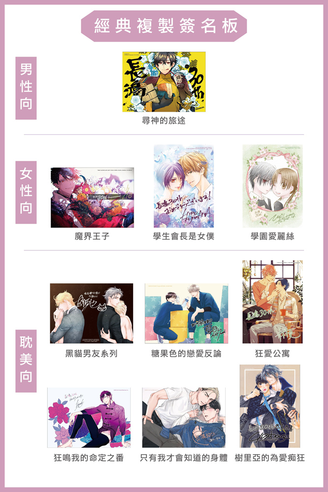 動漫節期間凡於長鴻會場購買任2件精品或任2件特裝版,即可獲得複製簽名板乙片,消費可累送。10種款式可自選,數量有限,送完為止!(※精品+特裝版各1組混搭將不列入計算)