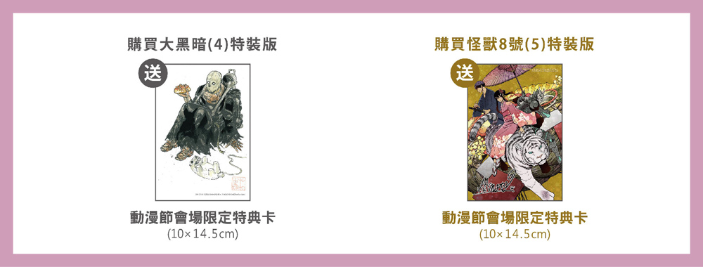 現場好康活動多更多,凡於會場購買《大黑暗》(4)特裝版或《怪獸8號》(5)特裝版(A、B款皆可),即贈送會場限定特典卡一張!消費可累送,數量有限,送完為止。