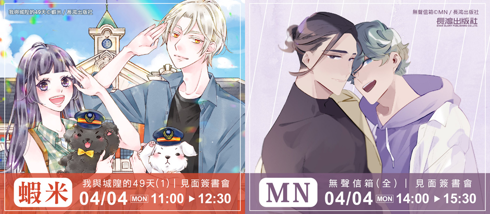 長鴻原創作品活動:想參加的原創漫畫家簽名會都只在北部嗎?長鴻原創作家將會親臨台中,擔任限時活動特派員,與中部的大家相見歡!只要於動漫節期間在長鴻內攤位購買《我與城隍的49天(1)》或《無聲信箱》,即可與蝦米老師或MN老師近距離互動,並請作家簽名。(活動現場僅限簽作者單行本)。