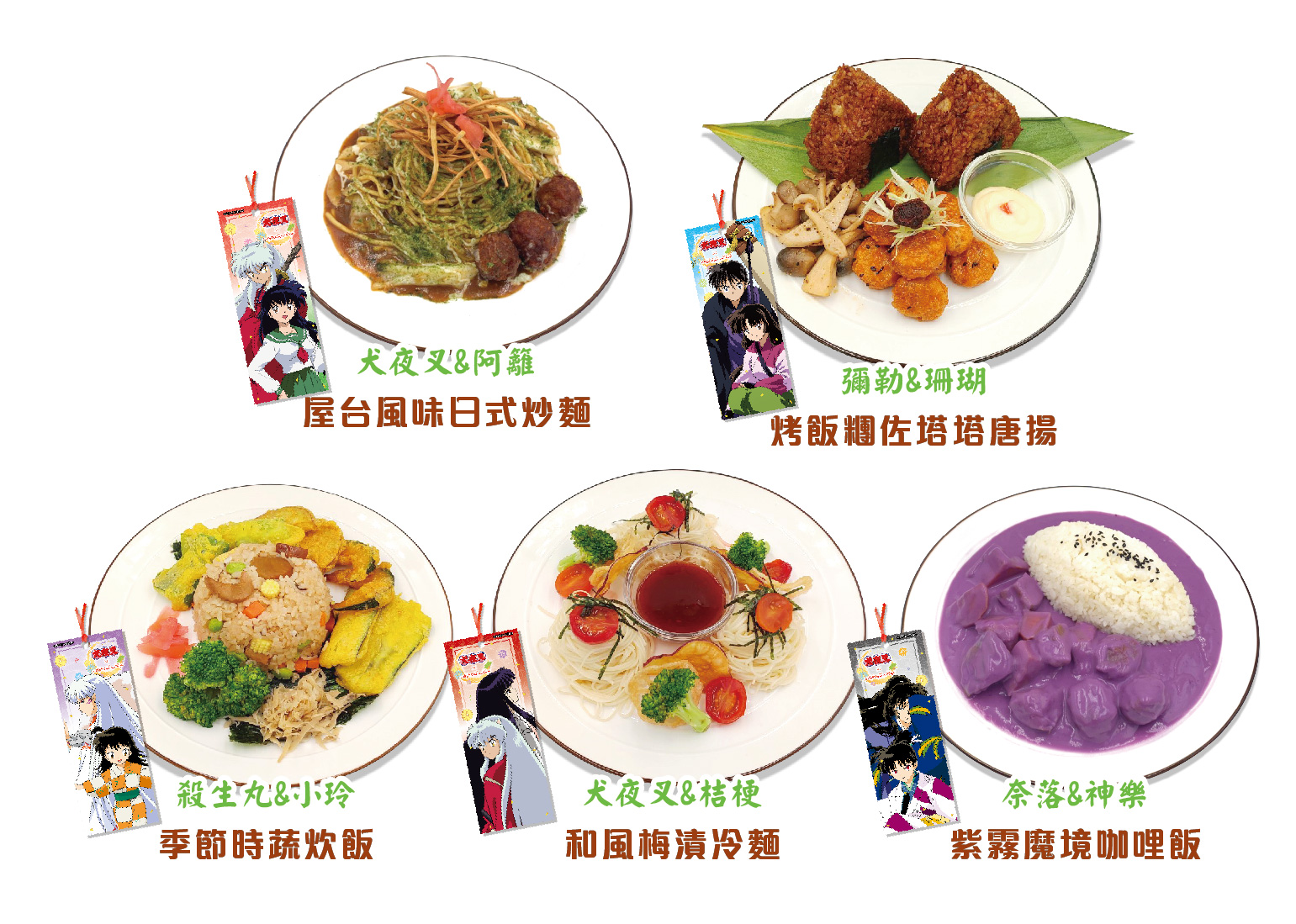 《犬夜叉x MyAnime Café》主視覺定調和風浪漫,全店以相同風格精心佈置,為粉絲獻上創意健康蔬食和風料理。本次主題餐以角色組合為設定,推出犬夜叉&阿籬的屋台風味日式炒麵、殺生丸&小玲的季節時蔬炊飯、彌勒&珊瑚的烤飯糰佐塔塔唐揚、奈落&神樂的紫霧魔境咖哩飯、犬夜叉&桔梗的和風梅漬冷麵,讓用餐者能透過料理沉浸在日式氛圍中,更加貼近角色日常。另外還有角色甜點、聖代,以及特調飲品,用餐均附贈專屬或隨機特典,均為台灣專場限定贈送,敬請把握時間來店享用。