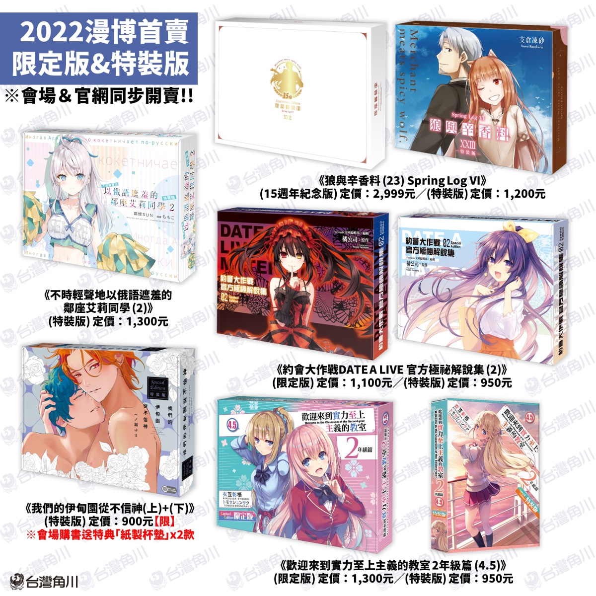 【2022年6月24日,台北訊】2022漫畫博覽會將在七月底隆重登場!台灣角川今日公開首賣書單情報,主打3款會場限定版及8款特裝版—即將推出動畫第二季的最強輕小說《歡迎來到實力至上主義的教室 2年生篇 (4.5)》、歡慶在台15周年《狼與辛香料 (23)》及《約會大作戰DATE A LIVE 官方極祕解說集 (2)》限定與特裝雙版本於會場與台灣角川官網開賣;此外,引爆話題輕小說《不時輕聲地以俄語遮羞的鄰座艾莉同學 (2)》及甫獲得BL AWARD 2022 BEST COMIC第3名殊榮漫畫《我們的伊甸園從不信神》也將推出特裝版。還有「KadoKado 角角者」人氣連載小說《神界直屬第十九號部門》、《地獄犬受難日》、《非限定Alpha》實體書將於2022漫博會場首賣,也同步推出特裝版,更多情報將陸續曝光。相關書訊請至台灣角川官網查詢https://kadokado.io/6Pp6D。