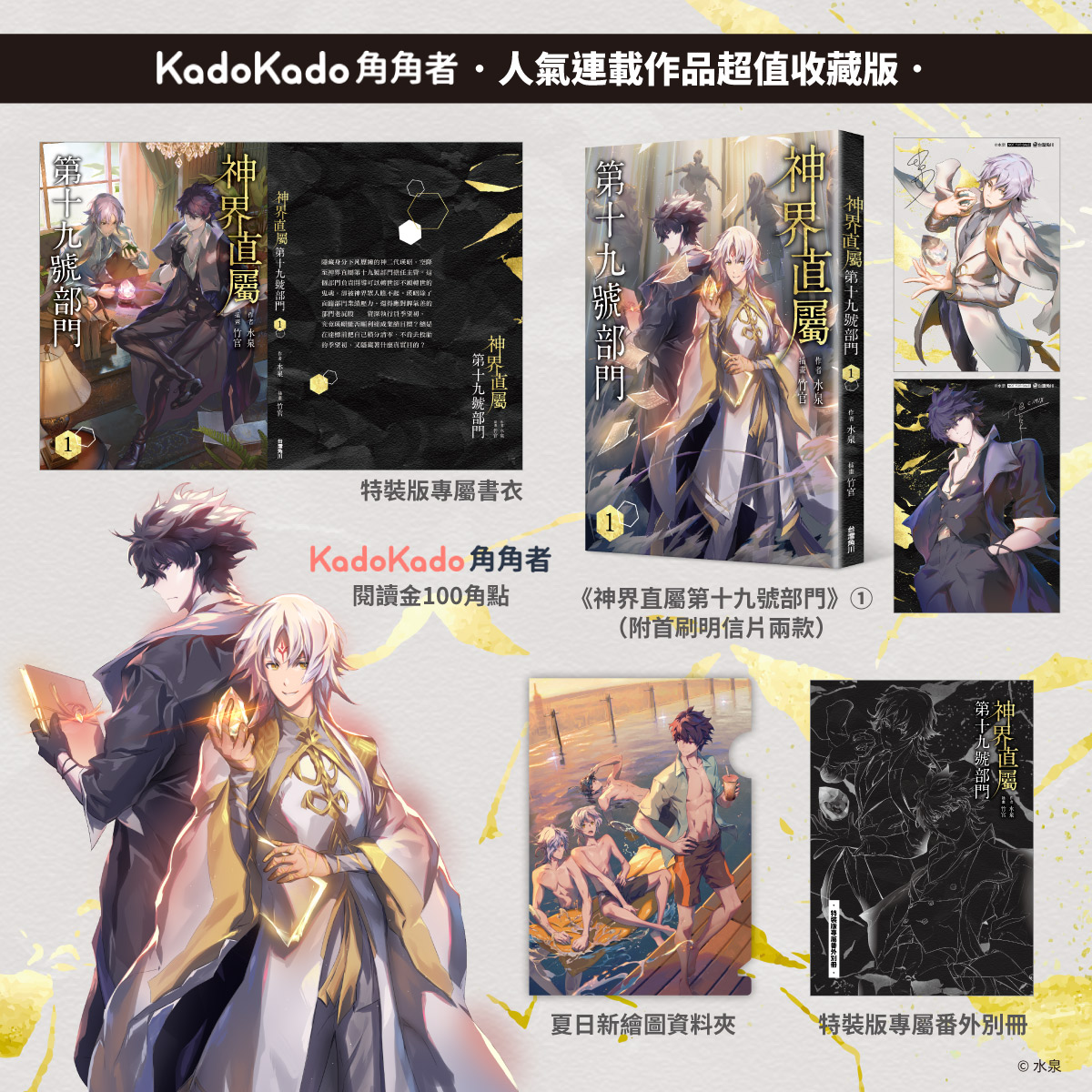 【2022年6月28日,台北訊】台灣角川將在2022漫畫博覽會推出「KadoKado 角角者」人氣連載作品實體書《神界直屬第十九號部門 (1)》,首刷附贈「印刷簽名明信片2款」及「KadoKado 角角者閱讀金50角點」;同步推出【超值收藏版】另收錄特典「夏日新繪圖<泳池嬉戲>A5資料夾」、「特裝版書衣」、「番外別冊」及「閱讀金100角點」。並於7/31(日)邀請作者水泉老師與插畫家竹官老師舉辦新書簽名會,現場在遵守大會防疫規範的前提之下,將與粉絲見面並分享精采創作秘辛!凡於2022漫畫博覽會「台灣角川攤位」購買平裝版或特裝版皆可憑發票兌換「水泉x竹官簽名會」資格券,限量100組名額發完為止。更多活動資訊:https://kadokado.io/1JskE。