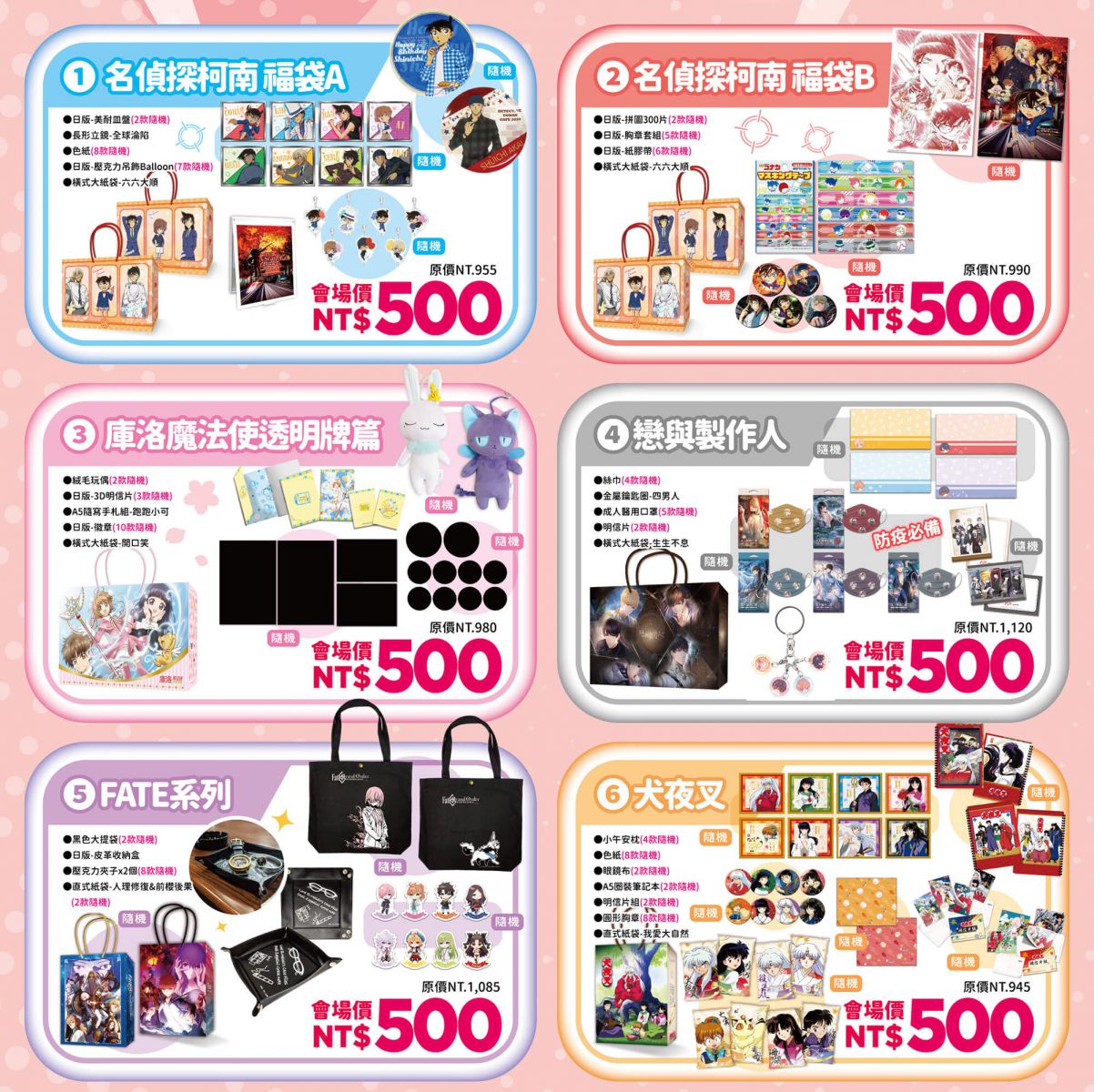 愉快省錢大絕招,來曼迪把台中限定福袋帶回家!《名偵探柯南》《庫洛魔法使》《戀與製作人》《Fate系列》《犬夜叉》5大作品6款福袋全數破盤價4折起,均一價只要500元,數量有限售完不補!一番賞也有新款到貨,《夏目友人帳》《魔物獵人》《FGO》大獎通通有,相信你的人品,有機會一抽入魂大獎帶回家!