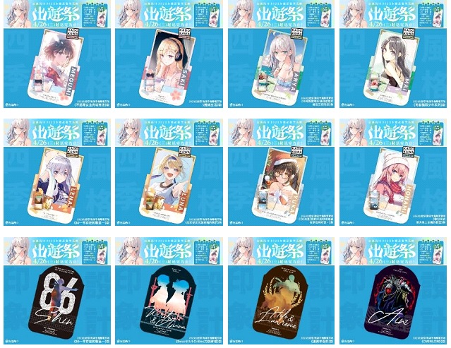 「2023春之出遊祭」活動限定特典「動漫手機靜電背貼」一共推出12款,收錄超人氣動漫作品──《86─不存在的戰區─》蕾娜款、辛款、《Sword Art Online刀劍神域》桐人x亞絲娜款、《狼與辛香料》羅倫斯x赫蘿款、《不時輕聲地以俄語遮羞的鄰座艾莉同學》艾莉款、《不起眼女主角培育法》加藤惠款、《歡迎來到實力至上主義的教室》一之瀨帆波款、《【好消息】我的不起眼未婚妻在家有夠可愛。》結花款、《義妹生活》沙季款、《青春豬頭少年系列》麻衣學姊款、《位於戀愛光譜極端的我們》月愛款,以及《OVERLORD》安茲大人款。「動漫手機靜電背貼」有兩種設計主題──以春夏秋冬四種特有氛圍設計的「四季風格」共8款,春季櫻花紛飛、夏季青春活力、秋季涼爽宜人、冬季浪漫唯美,搭配心愛角色們呈現出絕妙風景!此外,以低調有型時尚風格為主題的「印象設計」共4款,其中幾款採意象配色設計,完美融合各作品角色氛圍。4/26(三)起於指定書店消費滿額NT350即可獲得乙個,共12款絕讚特典值得收藏!