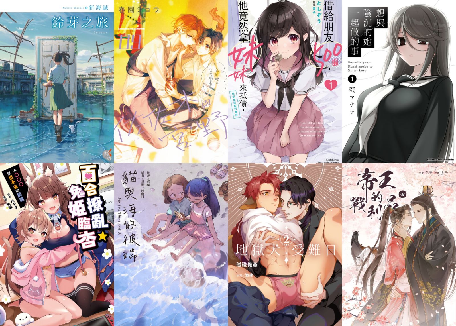 台灣角川「2023春之出遊祭」四月上市推薦新書 ——新海誠導演百億票房原著小說《鈴芽之旅》、近期超人氣劇場版感動獻映!話題漫畫續篇《佐佐木與宮野 (9)》、與朋友的妹妹臉紅心跳的同居生活《借給朋友500圓,他竟然拿妹妹來抵債,我到底該如何是好(1)》、與陰沉而難以接近的女孩之間的校園日常喜劇《想與陰沉的她一起做的事》、人氣Vtuber兔姬&杏仁ミル合體出擊的W女主角輕小說《百合撩亂★兔姬臨杏 ~不○○○就出不去的房間~》、榮獲「日本國際漫畫獎銀獎」原著同名小說《貓與海的彼端》、蔚為話題的調教系BL人氣小說《地獄犬受難日(2)》、晉江文學6.4億積分人氣作品《帝王的戰利品3+4(完)》…… 等,眾多精彩作品將於近期陸續上市。
