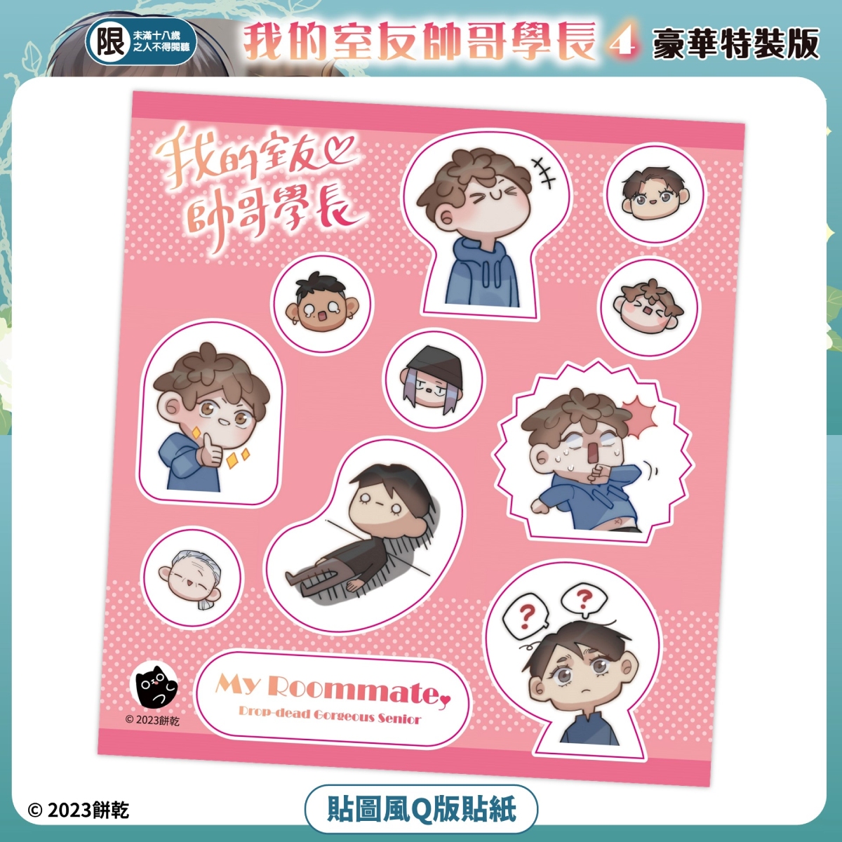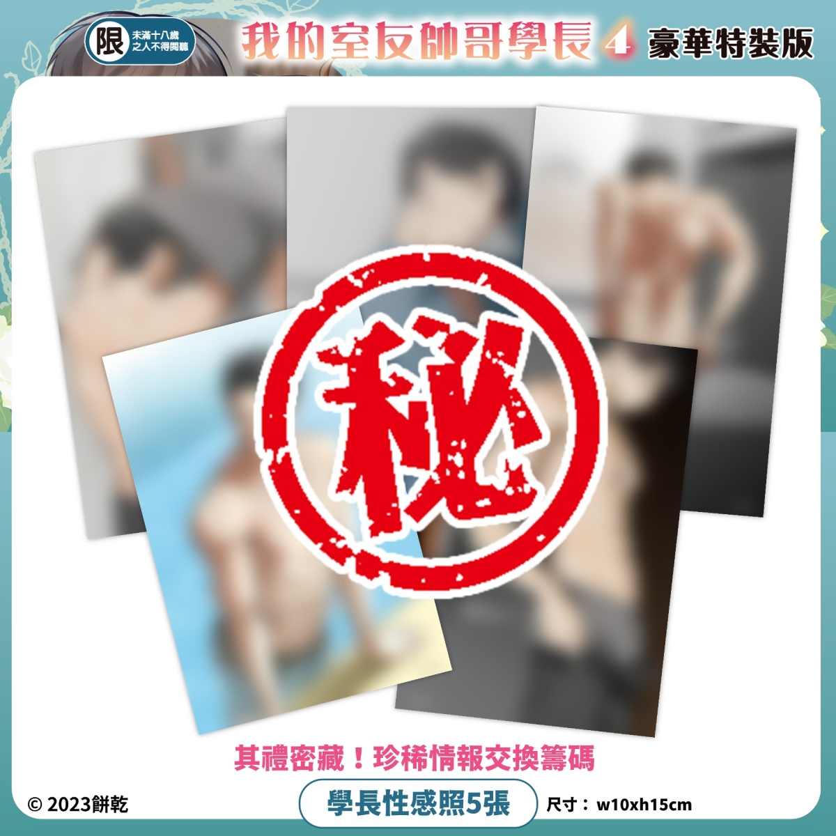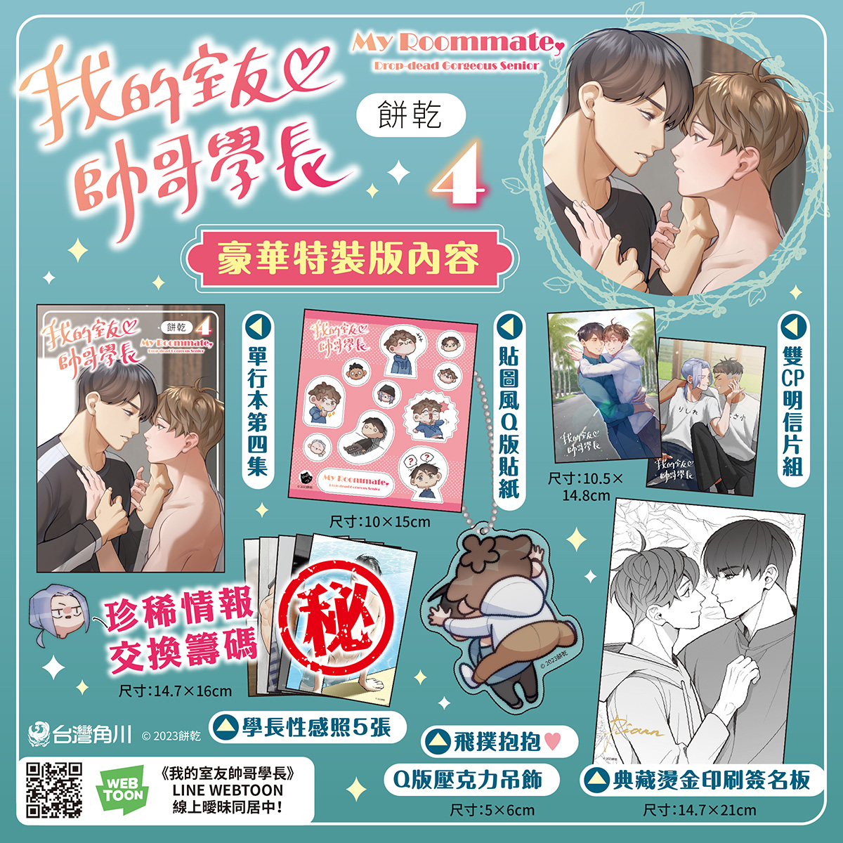 《我的室友帥哥學長 (4)》豪華特裝版絕讚特典:「其禮密藏!珍稀情報交換籌碼:學長性感照」、「學長x子云&辰宇x其禮 雙CP明信片組」、「貼圖風Q版貼紙」、「飛撲抱抱♥Q版壓克力吊飾」以及「典藏燙金印刷簽名板」,超豪華限定特典收錄在「特裝版PP珍藏書盒」。自即日起開放台灣角川官網獨家事前預購&漫博簽名會資格抽選登記至 6/26(一) 23:59 為止,預購連結:(https://kadokado.io/hu3wn)。豪華特裝版上市後數量有限售完為止,有意者請務必把握事前預購機會以免向隅!