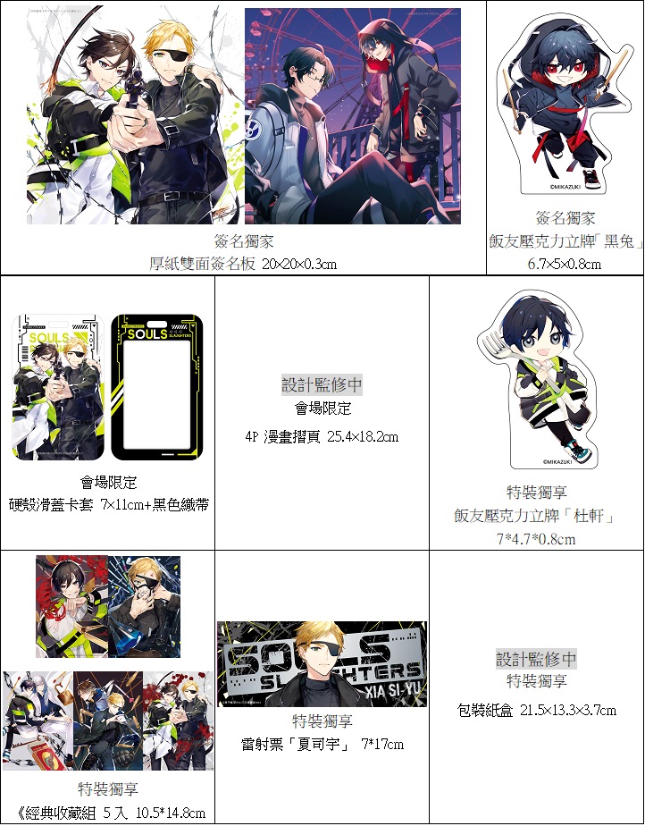 本次《殺戮靈魂》與《遊戲結束之前》還將會在現場首賣全新周邊「硬殼滑蓋式卡套」與「飯友壓克力立牌」。三日月書版特別邀請了知名台灣繪師˙三葉梨為作品的兩位主角傾心繪製飯友造型主題,滑蓋卡套定價只要169元,飯友立牌也只要129元。而且以上周邊都會是絕不再版的限量商品,想要獲得,就一定要到2023漫博會現場的三日月書版X朧月書版攤位喔!更多消息煩請密切注意三日月書版粉絲團、IG與Plurk。