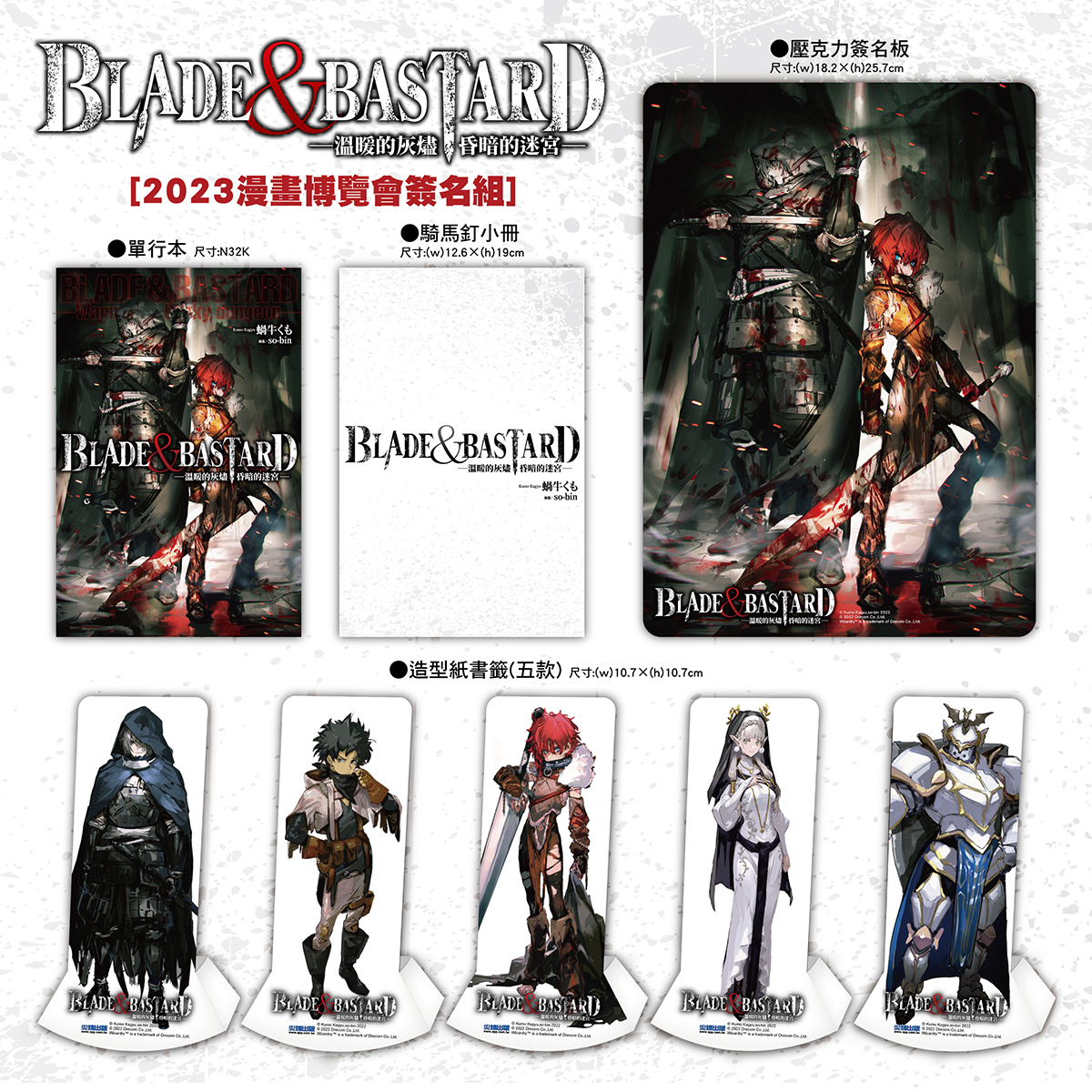 2023年漫畫博覽會來台限定!『BLADE & BASTARD (01) -溫暖的灰燼,昏暗的迷宮- 2023年漫畫博覽會簽名組』含第一集單行本、一本騎馬釘小冊、一份精美壓克力簽名板、五款造型書籤,詳細商品資訊與更多注意事項請見尖端網路書店簽名套組販售頁面,商品數量有限,售完為止!