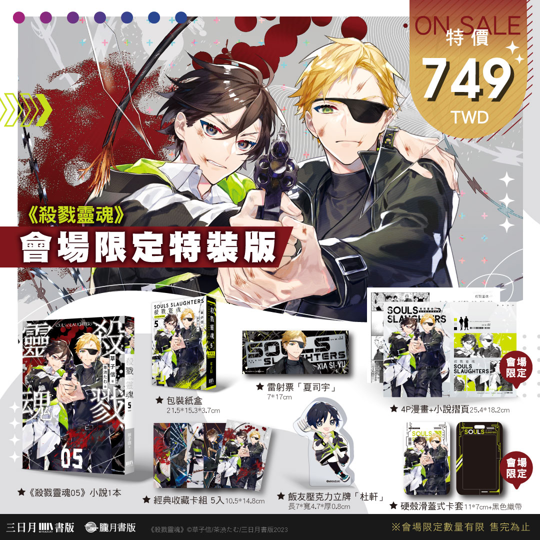 三日月書版&朧月書版將於這次2023年的漫畫博覽會期間推出10組會場限定版《殺戮靈魂05(完) 會場限定特裝版》、《青雨之絆前傳:昨日之歌 會場限定特裝版》、《聞瀾引(上下) 會場限定版》、《光與暗之詩 第五卷(完) 會場限定版》、《祛魅前的無眠之夜 會場限定版》、《這麼可愛一定是男孩子 上下 會場限定版》、《鋼鐵號角SP 會場限定版》、《柳樹浪漫01 會場限定版》、《可是祂又大又有錢耶 會場限定版》、《HERE U ARE 1+2 會場限定版》,內容包含「薄透晶磚」、「4P特典小冊子」與「拍立得明信片」,三日月書版與朧月書版更是分別邀請了老師們與知名繪師為作品撰寫全新番外或是繪製經典小劇場,所有品項都將是會場首賣且決不再版,超絕稀有的限量品喔!