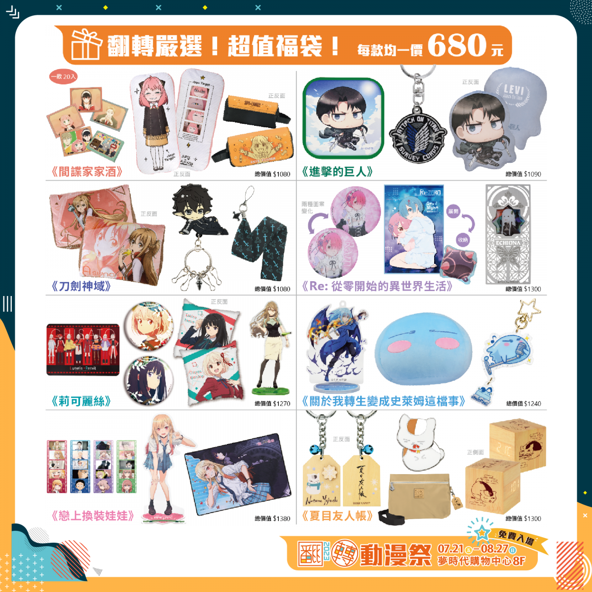 為了回饋粉絲推出了8款限量超值福袋,原價超過1000元的商品,通通只要680元,即將迎來最終結局的《進擊的巨人》、人氣居高不下的《SPY×FAMILY間諜家家酒》、《Lycoris Recoil莉可麗絲》、《刀劍神域》、《戀上換裝娃娃》、《Re:從零開始的異世界生活》、《夏目友人帳》、《關於我轉生變成史萊姆這檔事》,數量有限,建議開展第一天要火速前往搶購。