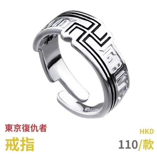 《東京復仇者》週邊,首推戒指,可調式設計,便於使用者自行調整戒圍,戒指表面設計是《東京復仇者》標誌性的 LOGO,而內裡則是「天上天下 唯有独尊」八字,又酷又有代表性,適合配搭各種造型。