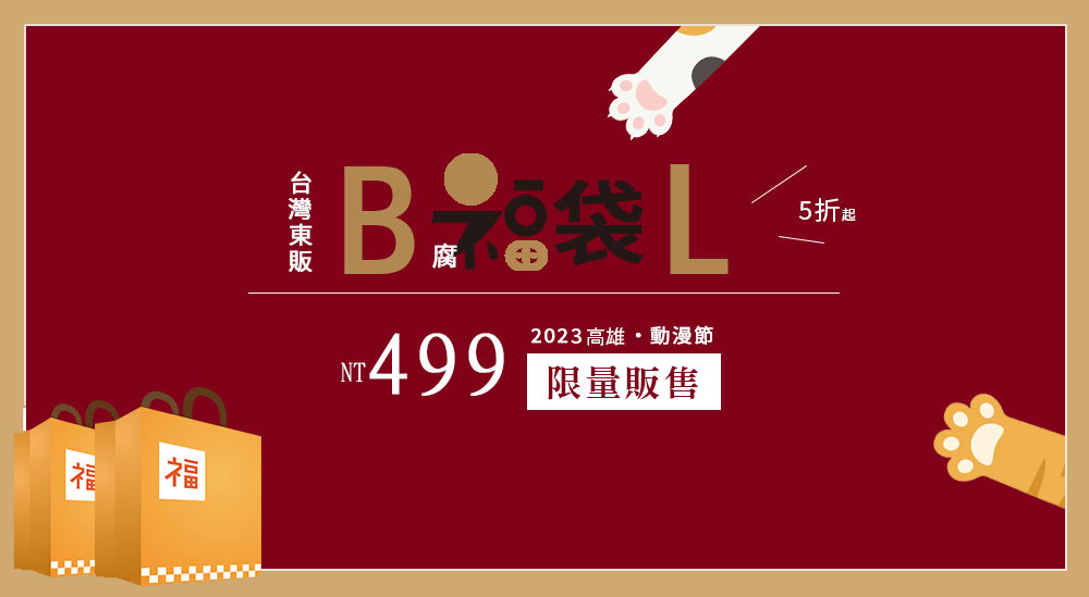 台灣東販推出了豐富多款的【BL原創精品福袋】,破盤下殺5折起,袋袋都是破千的經典BL人氣作品周邊,內容隨機包含了浮世繪門簾、立體手機座、質感化妝包、萬年曆、眼罩、大徽章、束口袋…等BL周邊,通通均一價只要NT$499,讓你心滿意足帶回家收藏。數量有限賣完為止,想以最優惠的價格入手一定要趁這個難得的好機會!精打細算的朋友快揪團一起出發高雄國際動漫節!