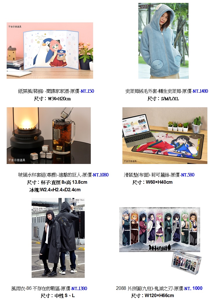 《SPY×FAMILY間諜家家酒》第二季在10月即將開播,這次木棉花特地推出了「間諜家家酒」的全新商品紙屏風,主圖是可愛的「安妮亞」一手抱著她最愛的花生,另一手勾著洛伊德買給安妮亞的禮物「企鵝」,超萌組合絕對必收!深受粉絲喜愛的動畫《關於我轉生變成史萊姆這檔事》這次也新出一款超可愛絨毛外套,快把它帶回家讓Q萌的史萊姆溫暖你的每個冬天。預計在今年11月初要播出完結篇(後篇)的《進擊的巨人 The Final Season》,推出了超精美的玻璃水杯套組,不僅有主要角色艾連、米卡莎和阿爾敏的圖案,還特別設計了調查兵團團徽的鐵片增添質感,還附上冰夾及四顆雷雕調查兵團團徽的不鏽鋼冰塊,用這個水杯裝自己喜歡的飲品一起迎接大結局,獻出你們的心臟吧!《莉可麗絲》則推出了新的布面滑鼠墊,圖案是穿著LycoReco咖啡廳制服的千束和瀧奈,用它陪你一起辦公、讀書,隨時補充活力!《86-不存在的戰區-》也帶來新週邊風雨衣,將在雨季為你提供最佳保護,讓你在戰場上展現出色的表現。穿上它,你將瞬間成為小隊中不可或缺的一員,與夥伴們並肩作戰。最後當然就是超人氣的《鬼滅之刃》啦!在新一季動畫播出前,先用九柱的2088片拼圖渡過等待的日子吧!