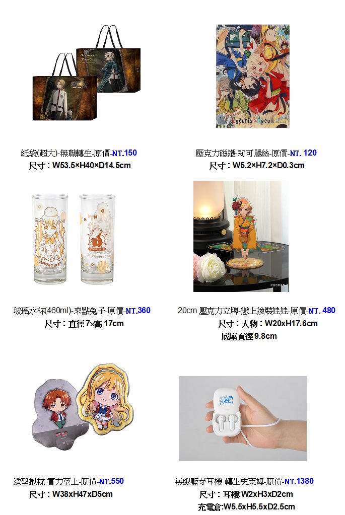 本次動漫節也推出消費滿額贈,精選好禮六重送,單筆消費滿550元,就可獲得只送不賣的《無職轉生Ⅱ》質感大紙袋,容量超大,剛好把漫博戰利品全部裝進去;滿1000元即贈送《莉可麗絲》壓克力磁鐵,讓可愛的千束和瀧奈陪你上班一整天,也是只送不賣喔!滿1999元的贈品則是《請問您今天要來點兔子嗎?》玻璃水杯;滿3299元可獲贈《戀上換裝娃娃》20公分壓克力立牌,滿5500元就送《歡迎來到實力至上主義的教室》造型抱枕,大尺寸很適合午睡使用,最高階消費滿額贈,單筆達8000元即贈送《關於我轉生變成史萊姆這檔事》入耳式無線藍芽耳機,超划算的滿額贈快來把他們通通帶回家!