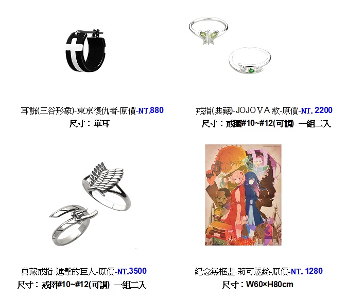 除了有多種好康優惠之外,當然還有木棉花超有誠意的精選商品要推薦給大家,首先是《東京復仇者》的三谷形象耳飾,以銅和不鏽鋼製成,獨具設計感,單耳佩戴真的帥到不行!接下來是《JOJO的奇妙冒險 石之海》的徐倫形象典藏戒指。這款戒指採用高品質的925純銀製成,並可調整大小,絕對是展現JOJO風格的經典之選。同樣是純銀戒指的還有《進擊的巨人》,共有兩款造型,一款是調查兵團團徽,另一款則是超硬質刀元素,作工精細,鐵粉真的必收藏!最後一個要推薦的精選商品就是《莉可麗絲》的紀念無框畫,材質是油畫布加上木頭框,質感精美,掛在房間裡整個氛圍都大提升! 所有最新、最優惠的動漫商品都在高雄國際動漫節的木棉花攤位!