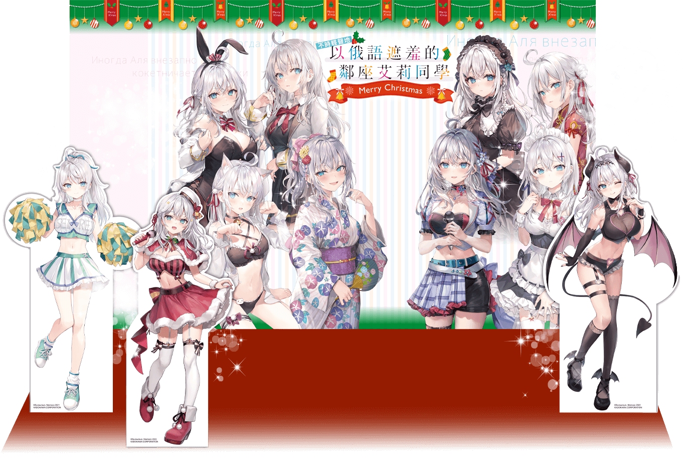 即將改編動畫化的超人氣話題輕小說《不時輕聲地以俄語遮羞的鄰座艾莉同學》,講述與奇蹟般的鄰座俄羅斯美少女高中生相遇後,展開甜度破表的青春戀愛喜劇!其中備受讀者喜愛的絕世銀髮美少女「艾莉」,擁有驚人美貌與姣好身材,在對男主角害羞或生悶氣時,會偷偷用俄語說出超級可愛的真心話,以極品傲嬌女神之姿擄獲廣大粉絲的心!《2023聖誕感謝祭》會場以聖誕節氛圍精心打造各種樣貌的艾莉擺設,活力啦啦隊女神、淘氣小惡魔、聖誕派對閃亮偶像..等,百變衣裝的艾莉同學,你的真愛Pick是哪一款呢?現場特別打造快閃店限定絕景,滿滿的艾莉老婆主題拍照牆,粉絲們千萬不能錯過!