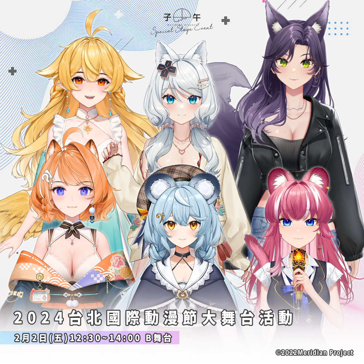 - 在2月2日(星期五)12:30至14:00子午計畫旗下藝人還將在台北國際動漫節的B舞台進行演出,屆時將帶來六位藝人們的精采表演,絕對是粉絲不可錯過的亮點。