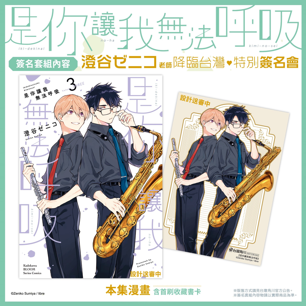 《是你讓我無法呼吸》簽名套組內容──以兩人超有愛的各種甜蜜互動為主題設計「精美簽名板」、「愛心徽章2入組」、演奏樂器時默契十足的可愛模樣「壓克力立牌」以及「第三集漫畫含首刷收藏書卡」全數將收錄在簽名資格套組限定的「精緻提袋」。簽名套組將於12/21(四)~ 12/25(一)限時五天開放至台灣角川官網登記抽選資格,可登記簽名會場次分別為【2024動漫節場】(限額120名)及【安利美特場】(限額100名),因活動名額有限,每位讀者僅限登記一個場次。關於更多簽名套組以及抽選活動說明,請參考官網連結:(https://kadokado.io/Ql2cD)。