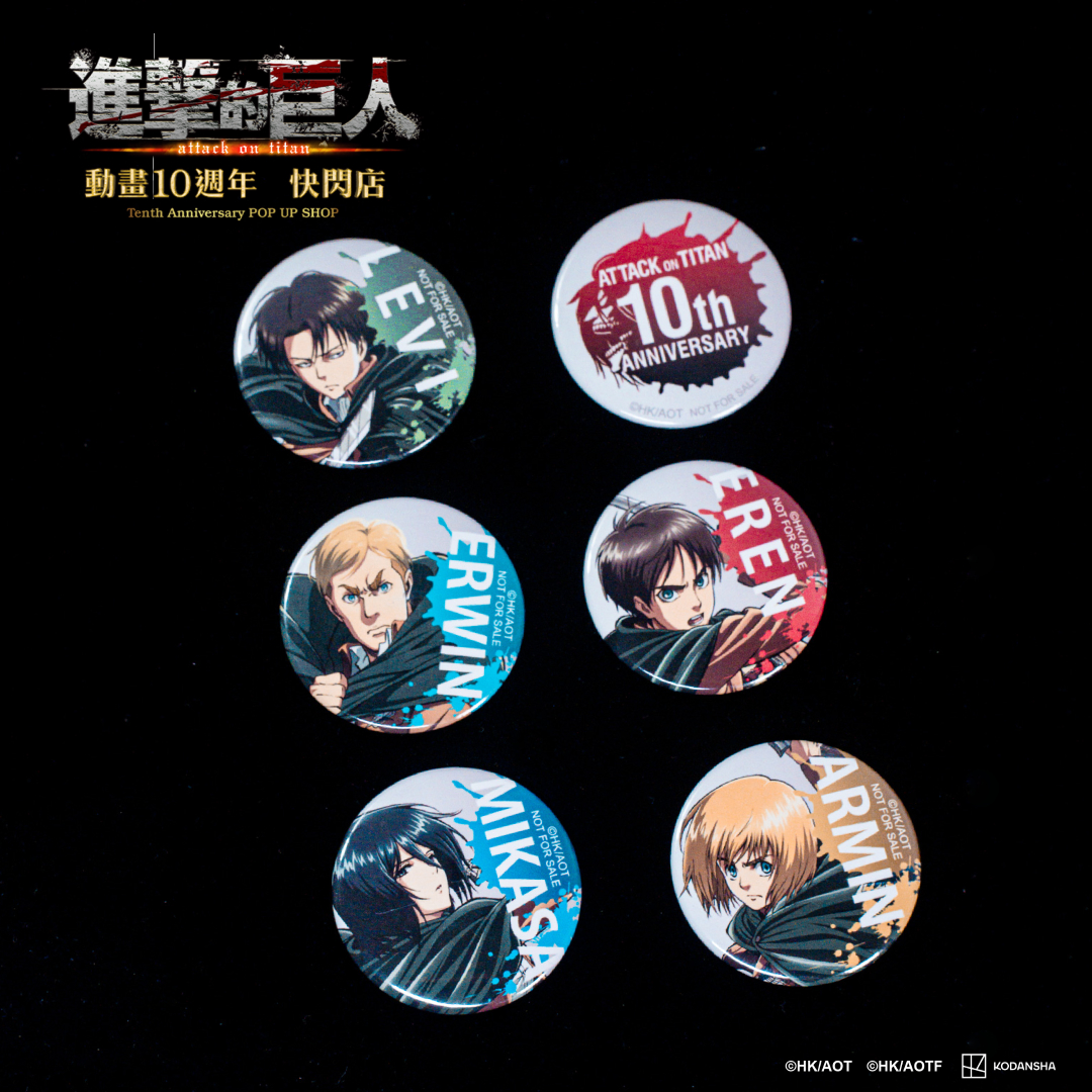 而開幕首四日到店的粉絲更有機會獲得10週年LOGO特製贈品,1/18-1/21全店單筆消費滿2000元就贈10周年LOGO金屬杯墊乙個,每日限量50個。1/22-3/10則是單筆滿899元贈盲抽磁鐵乙個,另外快閃店全檔期間滿1200元還贈10週年限定限量紙袋喔!《進擊的巨人》動畫10週年快閃店從店裝到商品準備了滿滿全系列《進擊的巨人》動畫元素,歡迎粉絲共襄盛舉,更多詳細消息務必關注木棉花官方粉絲專頁!