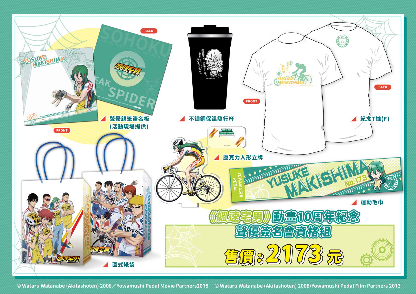 以公路自行車競技為主題的作品《飆速宅男》,不僅漫畫發行突破3000萬本,改編動畫後成功帶起自行車運動風潮,讓更多人從室內走到戶外,感受自行車運動的奧妙! TV動畫自2013年開始播出,至今放送至第5期,為近年來少見的長篇型改編動畫。為慶祝《飆速宅男》動畫推出邁入10周年,曼迪傳播將於台北國際動漫節,特地邀請為本作人氣角色卷島裕介配音的聲優 森久保祥太郎先生來台舉辦簽名會。限額150名簽名會資格組將在1/10中午12點於MyAnime Square官網開賣,售價以LOVE卷島(背號173)規劃為2,173元,購買者除了可享有活動參加資格,更能獲得《飆速宅男》動畫最新紀念商品,名額有限敬請把握!