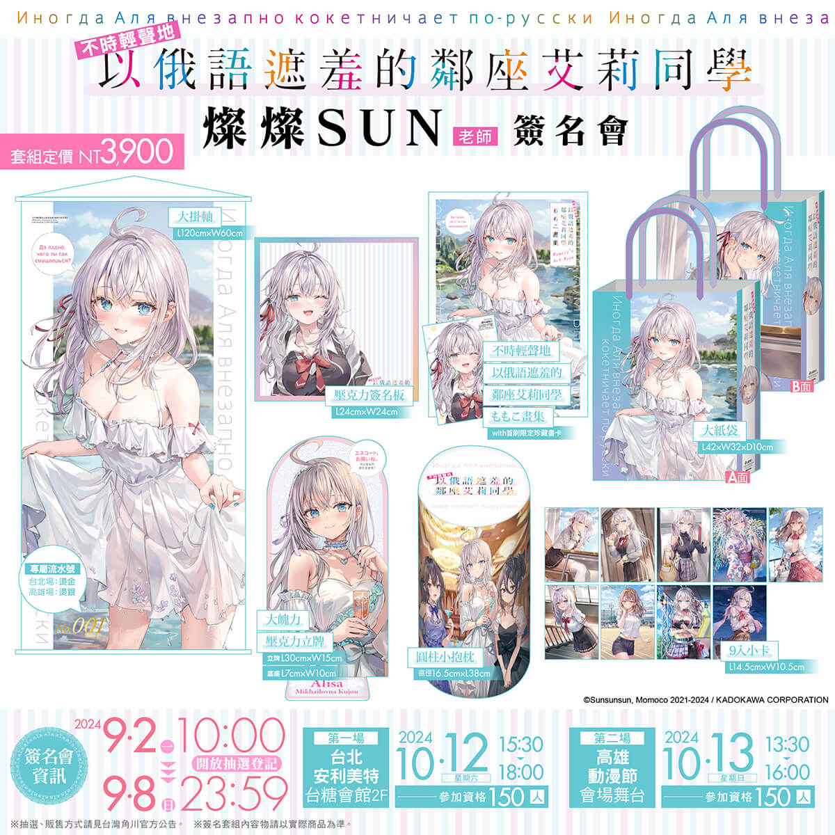 本屆高雄國際動漫節搭配七月話題新番,特別邀請《不時輕聲地以俄語遮羞的鄰座艾莉同學》作者老師燦燦SUN首次來台,並舉辦兩場簽名會活動與粉絲們近距離互動,現場將分享作品誕生契機、創作秘辛與人物小故事,也會透露關於劇情的未來方向!活動分別將在2024年10月12日(六)於台北安利美特、10月13日(日)高雄動漫節盛大舉辦,有興趣的讀者朋友們千萬不能錯過如此千載難逢機會!活動簽名套組將於台灣角川官網開放登記抽選全台僅限量300組的購買資格,詳細辦法請至官網或粉絲團查詢。