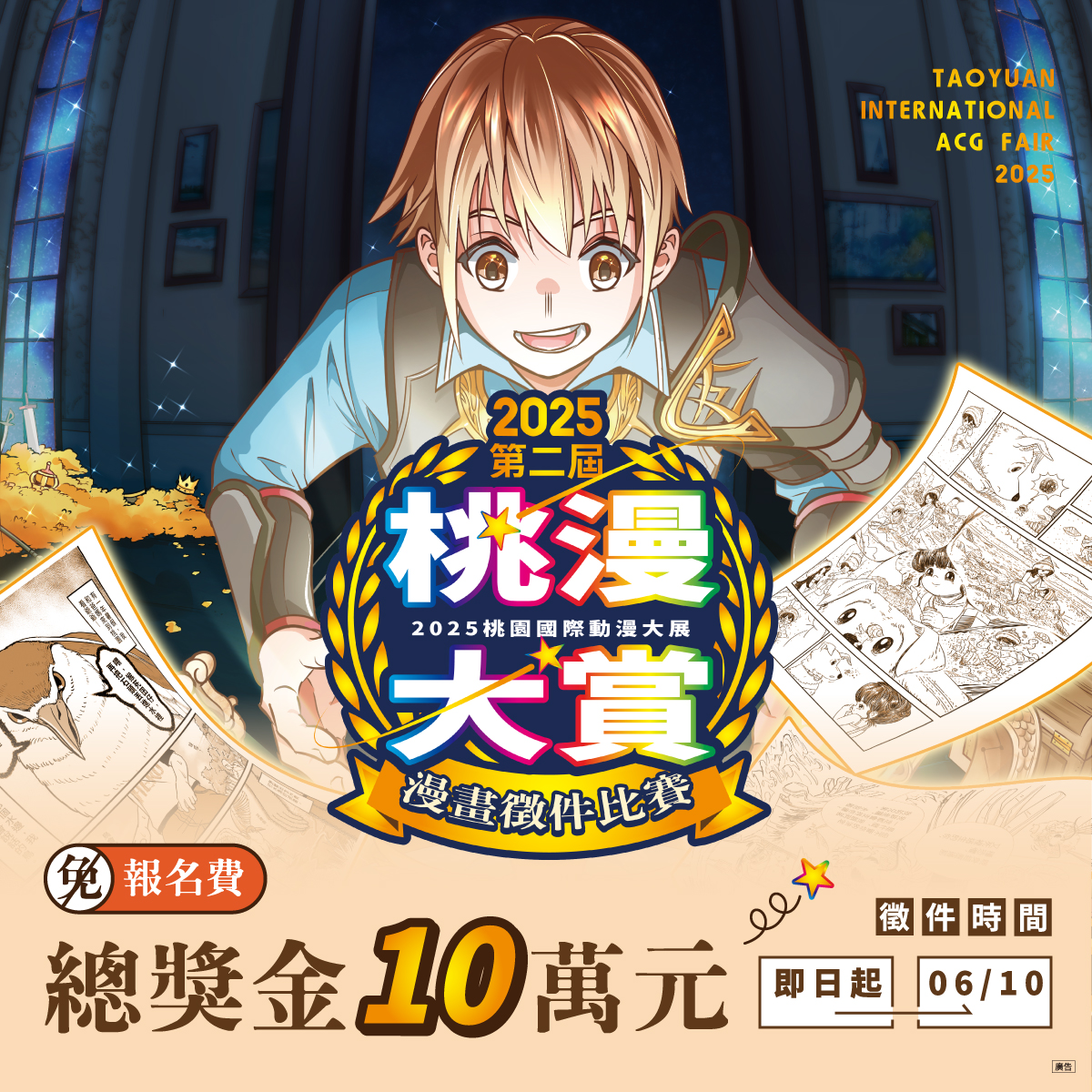 即日起至2025年6月10日止,歡迎全台漫畫創作者踴躍投件,詳細參賽辦法請至「桃園國際動漫大展」臉書粉絲專頁下載查詢,誠摯邀請您一同參與這場年度動漫創作盛會!更多動漫資訊請追蹤「桃園國際動漫大展」臉書粉絲專頁:https://www.facebook.com/taoyuan.public/