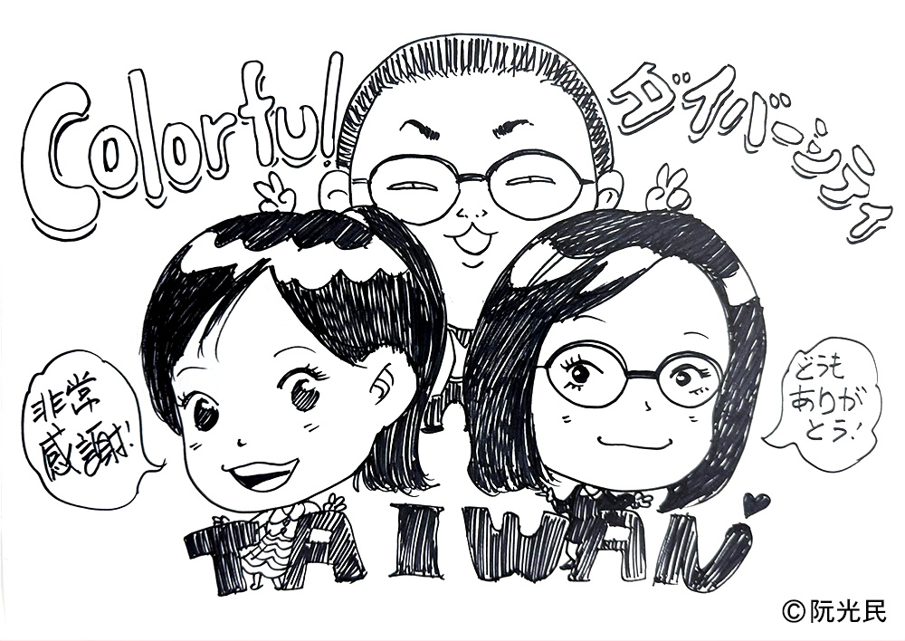 漫畫家阮光民特別展出他所繪製本次參加開幕式的3位漫畫家的Q版造型加上台日友好字樣(提供者:駐日台灣文化中心)