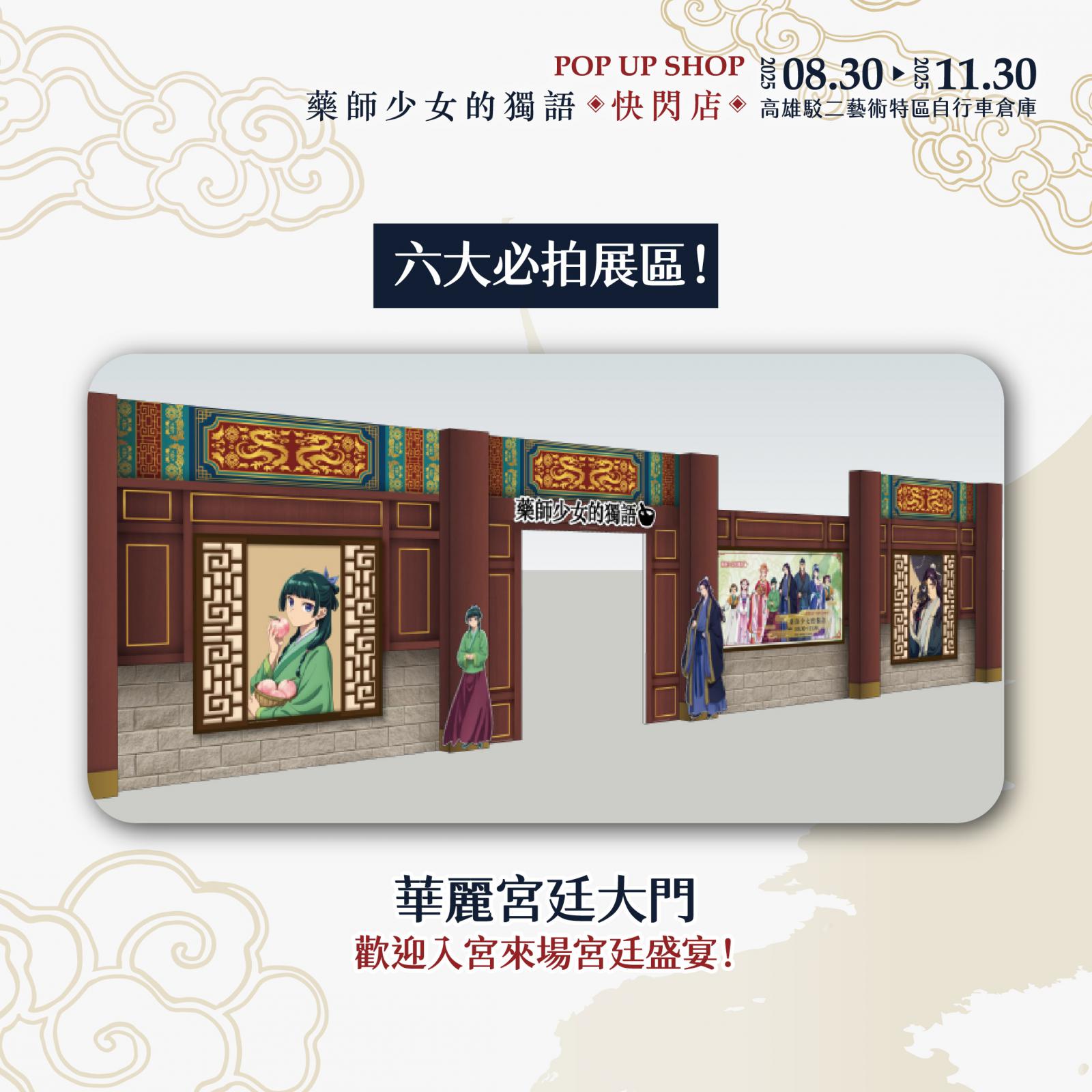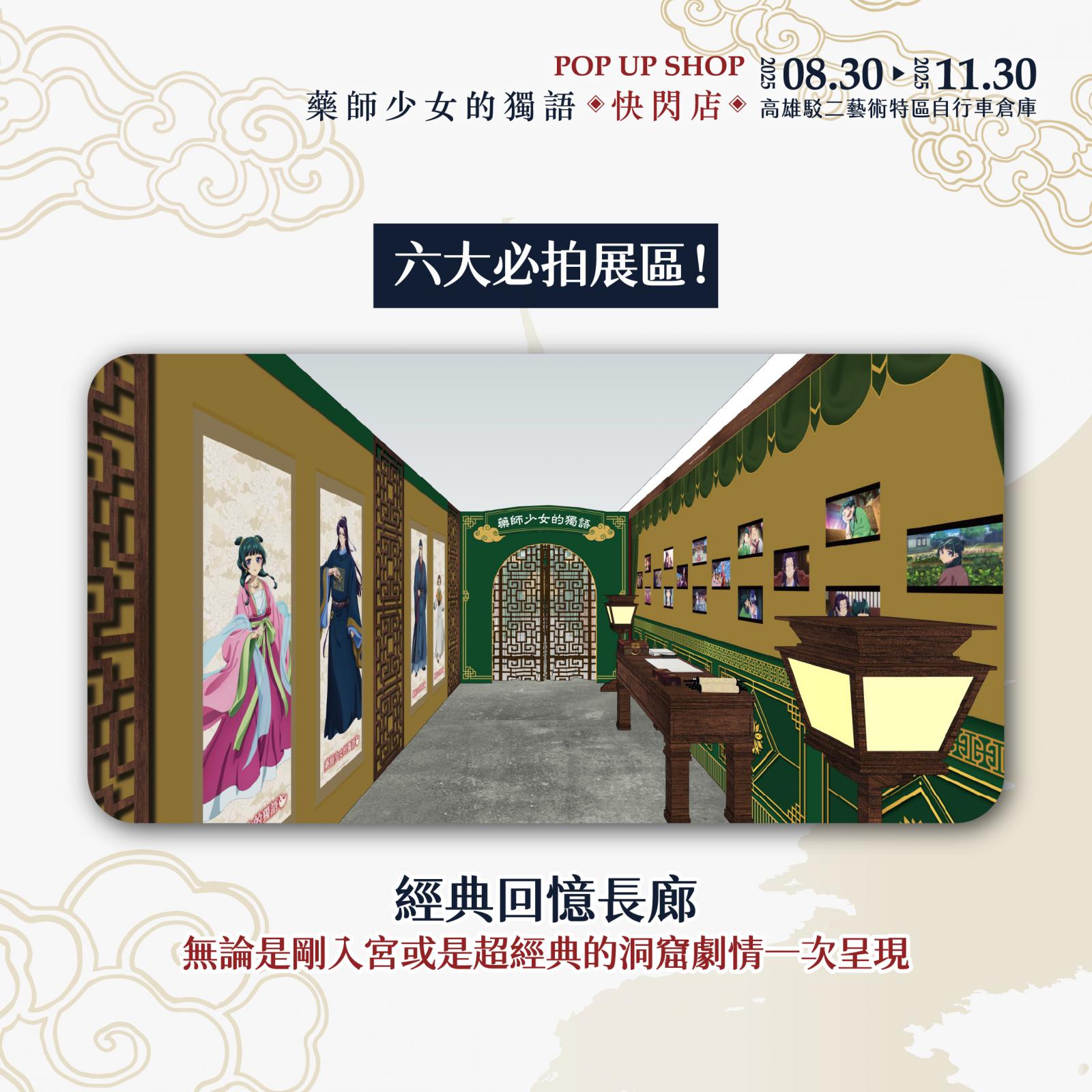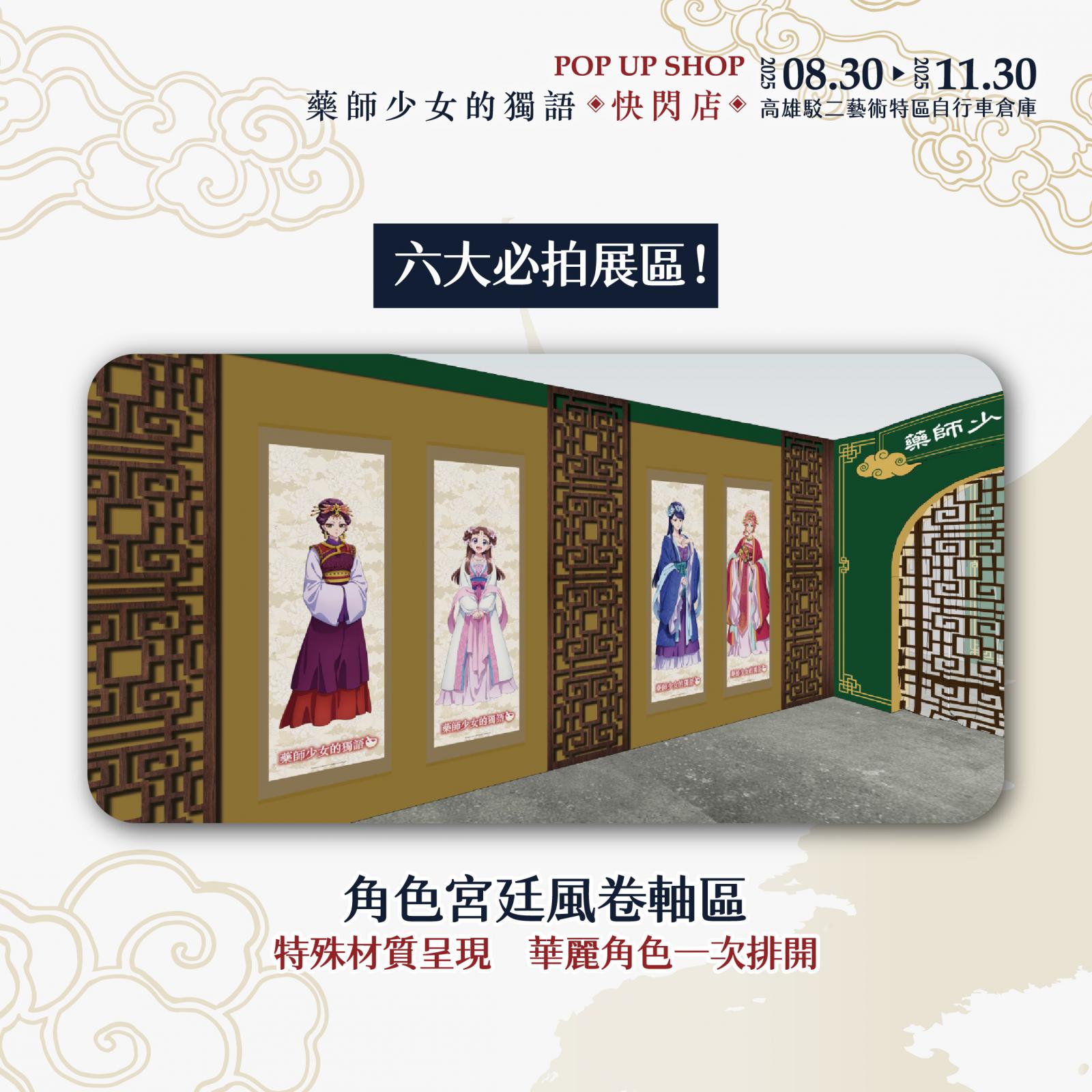 展區入口即是第一大亮點!「華麗宮廷大門」超有氣勢,貓貓與壬氏站在入口迎接大家的到來,走進快閃店首先映入眼簾的是動畫大型主視覺,一整排角色如同親自迎接粉絲到來。第二亮點是「主角圍繞的宮廷椅區」特別設置的宮廷座椅讓大家能與貓貓、壬氏、玉葉妃及高順一同合影,體驗華麗的宮廷氛圍。接續的是「經典回憶長廊」場景回顧區更完整重現第一、二季的經典畫面,從第一季中貓貓指認「這個有毒」的名場景,到第二季壬氏於月光下翩然起舞,以及與貓貓一同墜入洞窟的瞬間,彷彿將觀眾再次拉回劇情的精彩時刻。第四大是「角色宮廷風卷軸區」場景牆另一側則展示多位主要角色的精緻卷軸,貓貓、壬氏、高順、小蘭、樓蘭妃、里樹妃與梨花妃一字排開,宛如親身步入宮廷深處。隨後進入「氣勢主視覺」,歷季的經典主視覺也完整呈現,讓粉絲拍照打卡一次蒐集。最後是本展區最大亮點3米高的貓貓氣偶即將降臨快閃店,將會依照監修狀況解禁,粉絲朋友盡請期待!