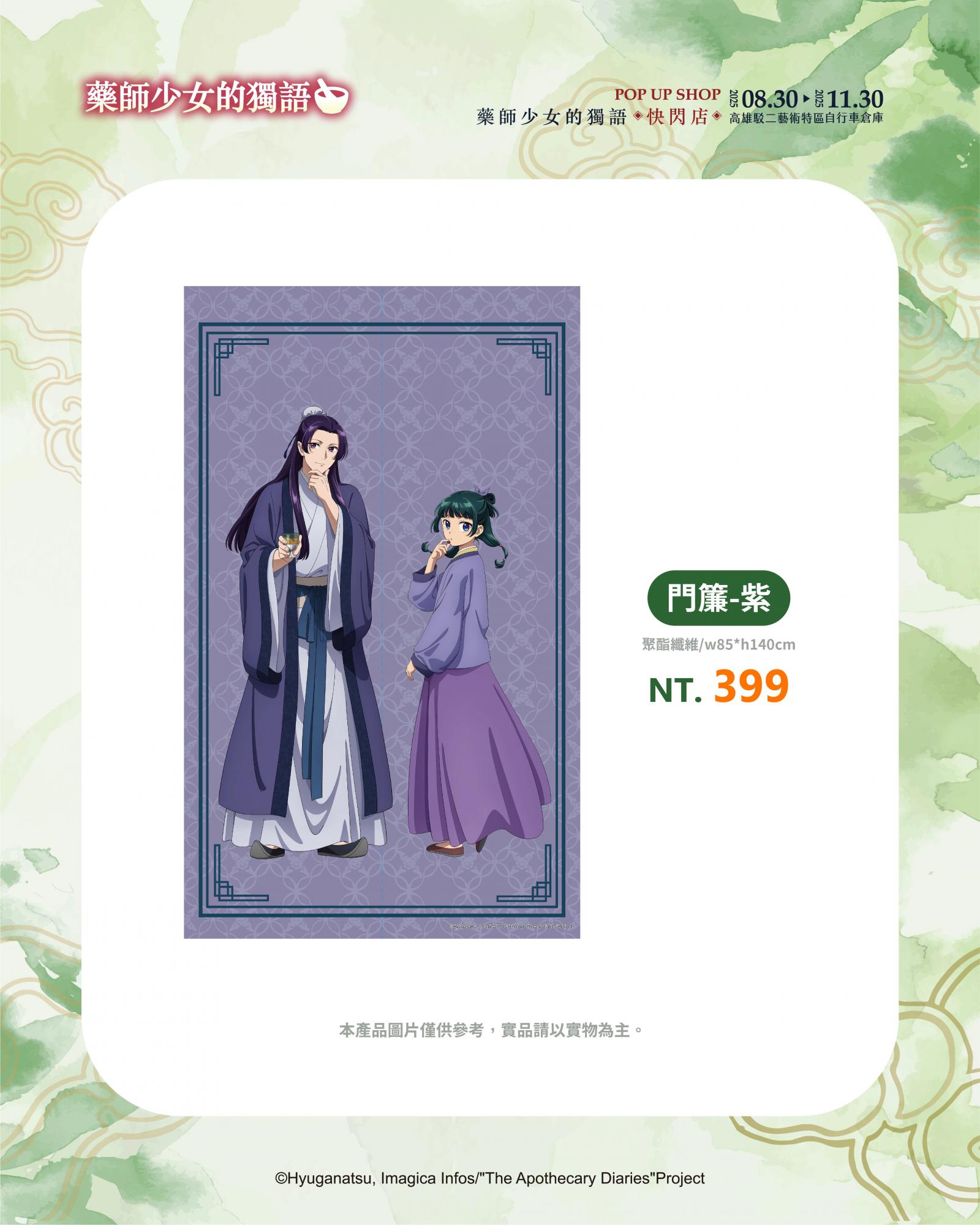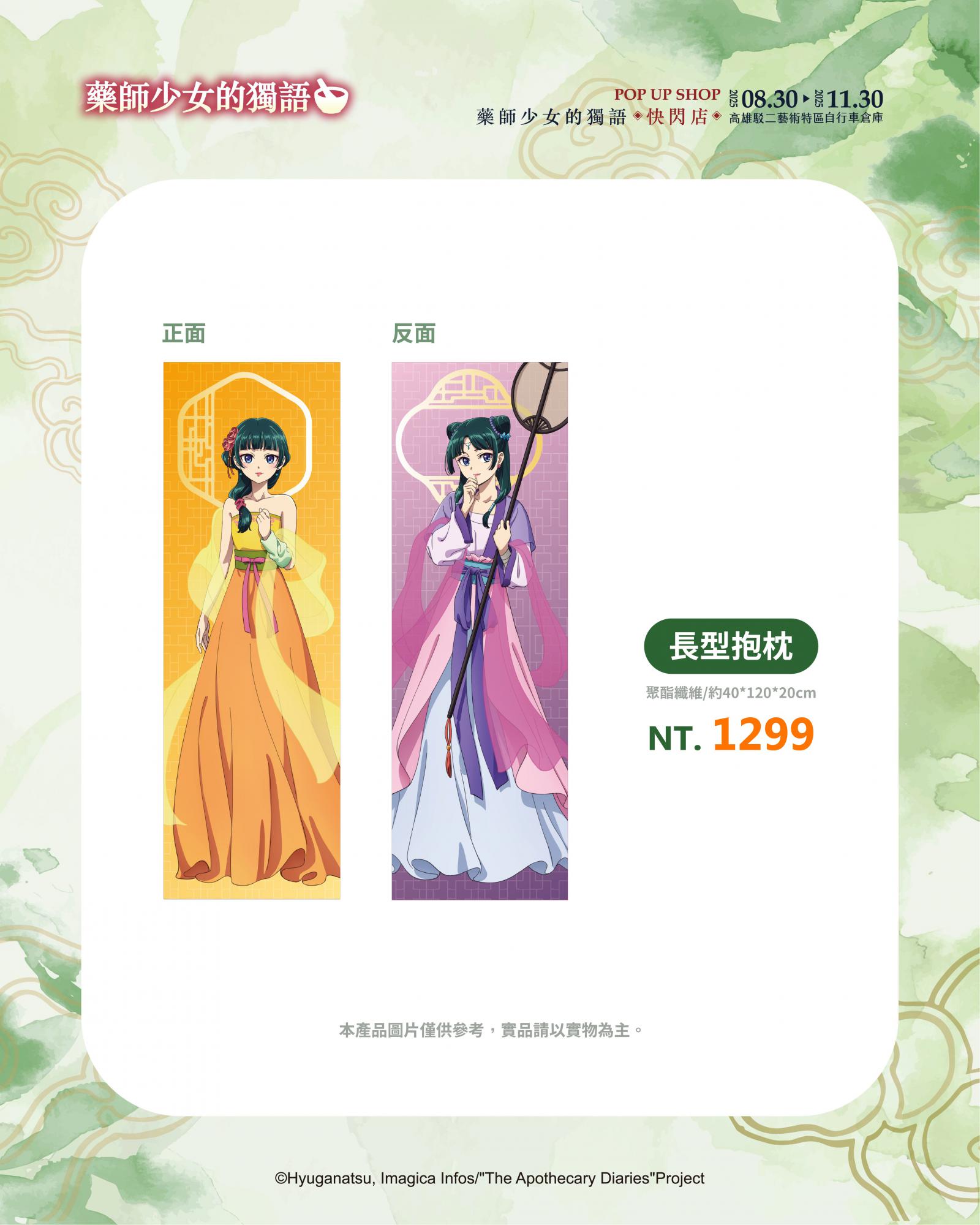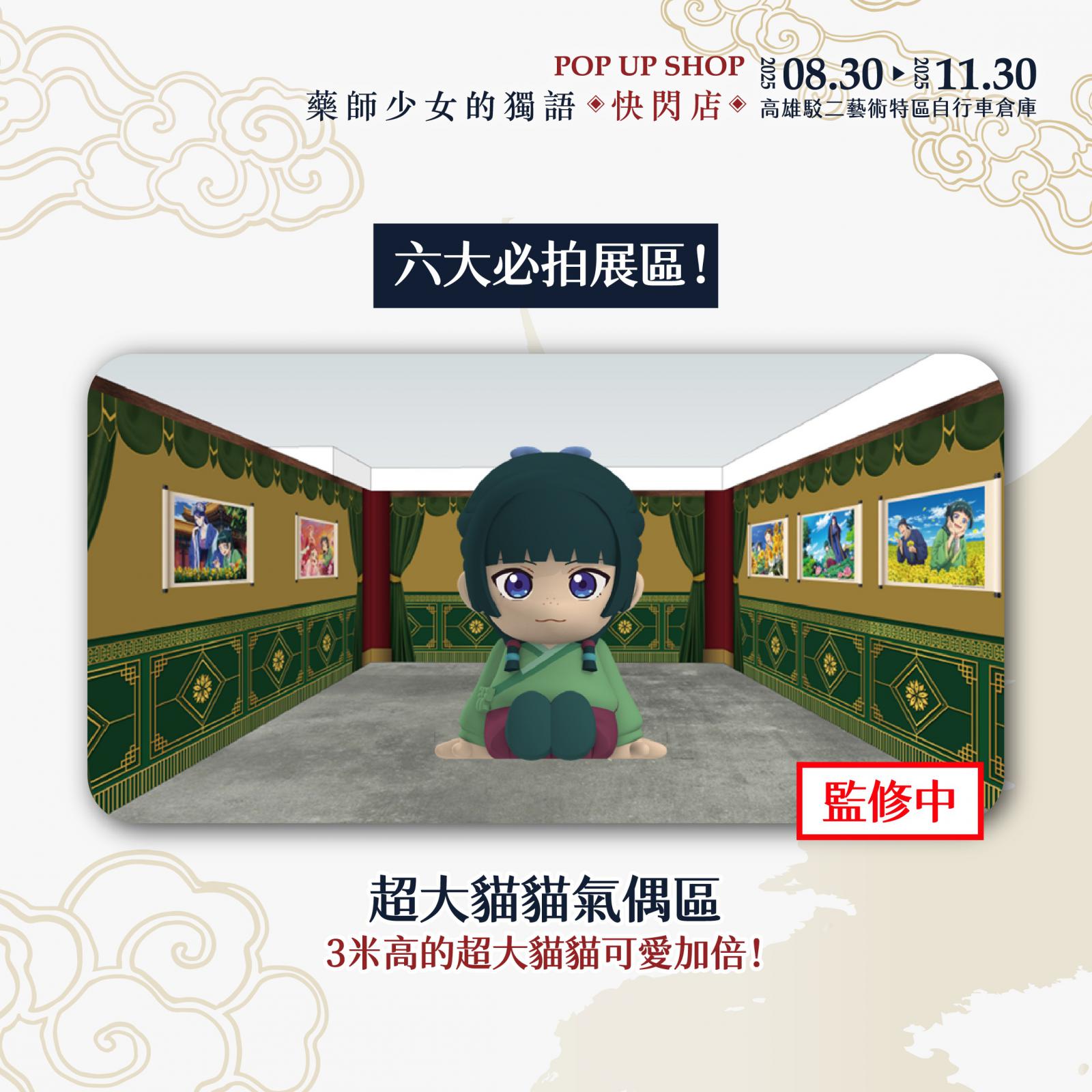 展區入口即是第一大亮點!「華麗宮廷大門」超有氣勢,貓貓與壬氏站在入口迎接大家的到來,走進快閃店首先映入眼簾的是動畫大型主視覺,一整排角色如同親自迎接粉絲到來。第二亮點是「主角圍繞的宮廷椅區」特別設置的宮廷座椅讓大家能與貓貓、壬氏、玉葉妃及高順一同合影,體驗華麗的宮廷氛圍。接續的是「經典回憶長廊」場景回顧區更完整重現第一、二季的經典畫面,從第一季中貓貓指認「這個有毒」的名場景,到第二季壬氏於月光下翩然起舞,以及與貓貓一同墜入洞窟的瞬間,彷彿將觀眾再次拉回劇情的精彩時刻。第四大是「角色宮廷風卷軸區」場景牆另一側則展示多位主要角色的精緻卷軸,貓貓、壬氏、高順、小蘭、樓蘭妃、里樹妃與梨花妃一字排開,宛如親身步入宮廷深處。隨後進入「氣勢主視覺」,歷季的經典主視覺也完整呈現,讓粉絲拍照打卡一次蒐集。最後是本展區最大亮點3米高的貓貓氣偶即將降臨快閃店,將會依照監修狀況解禁,粉絲朋友盡請期待!