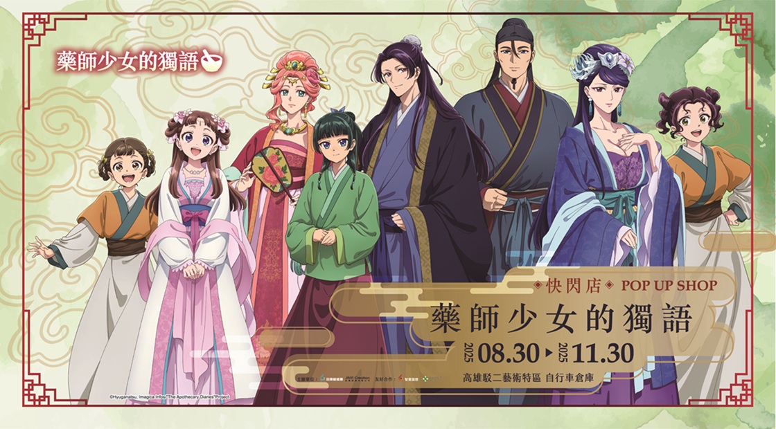超人氣動畫《藥師少女的獨語》快閃店即將在8月30日高雄駁二特區自行車倉庫登場!充滿宮鬥元素的 《藥師少女的獨語》憑藉著解謎的吸引人一步一步看下去的故事情節,以及貓貓與壬氏的角色魅力掀起全球熱潮。而此次由「回歸線娛樂」與「金儀創意」一起合作舉辦的《藥師少女的獨語》快閃店將於8月30日至11月30日於高雄駁二特區盛大登場,現場有三大必完成任務!必拍「6大沉浸式宮廷拍照區」3米高貓貓即將降臨快閃店、必買「破百款全新周邊商品」,從收藏海報到實用小物應有盡有。還有必拿的「解謎互動遊戲透卡」與「滿額贈禮」,真的太豐富了,統整了粉絲來到《藥師少女的獨語》快閃店絕不能錯過的任務,一定要來這場專屬於貓貓與壬氏的宮廷盛會。