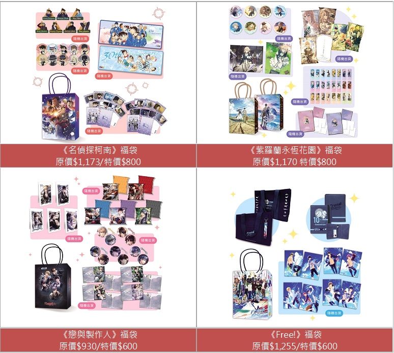 一年一度的高雄動漫節,一定給大家最優惠好康!曼迪限量推出福袋4天王組合:《戀與製作人》《Free!》《名偵探柯南》《紫羅蘭永恆花園》,最低價600元,低於市價5折起實在太划算,開展第一攤絕對先衝曼迪,數量有限售完不補!滿額活動也不可錯過,當日於攤位內單筆消費滿600元即送精美紙袋,滿800元送小立牌、滿1000元還有會將高價日版模型帶回家!此外,只要購買《戀與製作人》周邊商品,結帳滿200元就送特製收藏卡,活動獎項數量有限,愈早買享愈多,把握連假逛展最佳機會,更多情報請密切注意曼迪傳播官網及粉專公告。