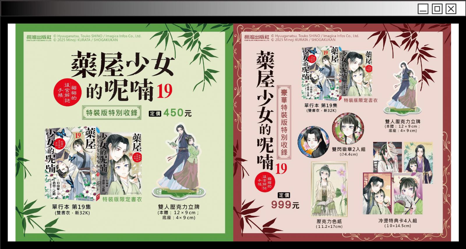 壬氏能平定這場叛亂,救出貓貓嗎!?本次倉田三之路《藥屋少女的呢喃~貓貓的後宮解謎手帳~19)》推出一般特裝版及豪華特裝版,一般特裝版內含單行本第19集、特裝版限定書衣及雙人壓克力立牌,豪華特裝版除了有一般特裝版的商品外,還另外收錄壓克力色紙、雙閃徽章二入組及冷燙特典卡四入組。