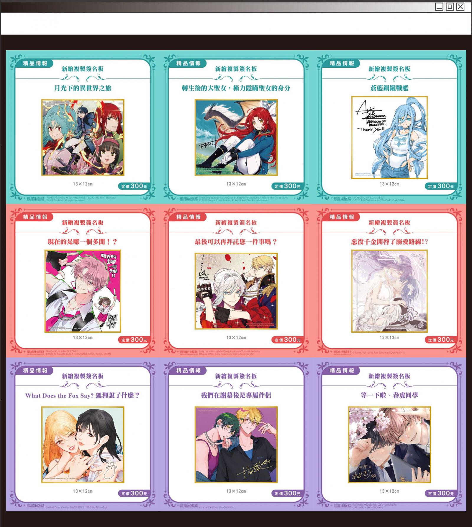 本次高雄動漫節現場複製簽名板將會販售以下9個新款式:《月光下的異世界之旅》、《轉生後的大聖女,極力隱瞞聖女的身分》、《蒼藍鋼鐵戰艦》、《現在是哪一個多聞!?》、《最後可以再拜託您一件事嗎?》、《惡役千金開啟了溺愛路線!?》、《What Does the Fox Say?狐狸說了什麼?》、《我們在謝幕後是專屬伴侶》、《等一下啦、春虎同學》。歡迎各位粉絲前往現場購買收藏!