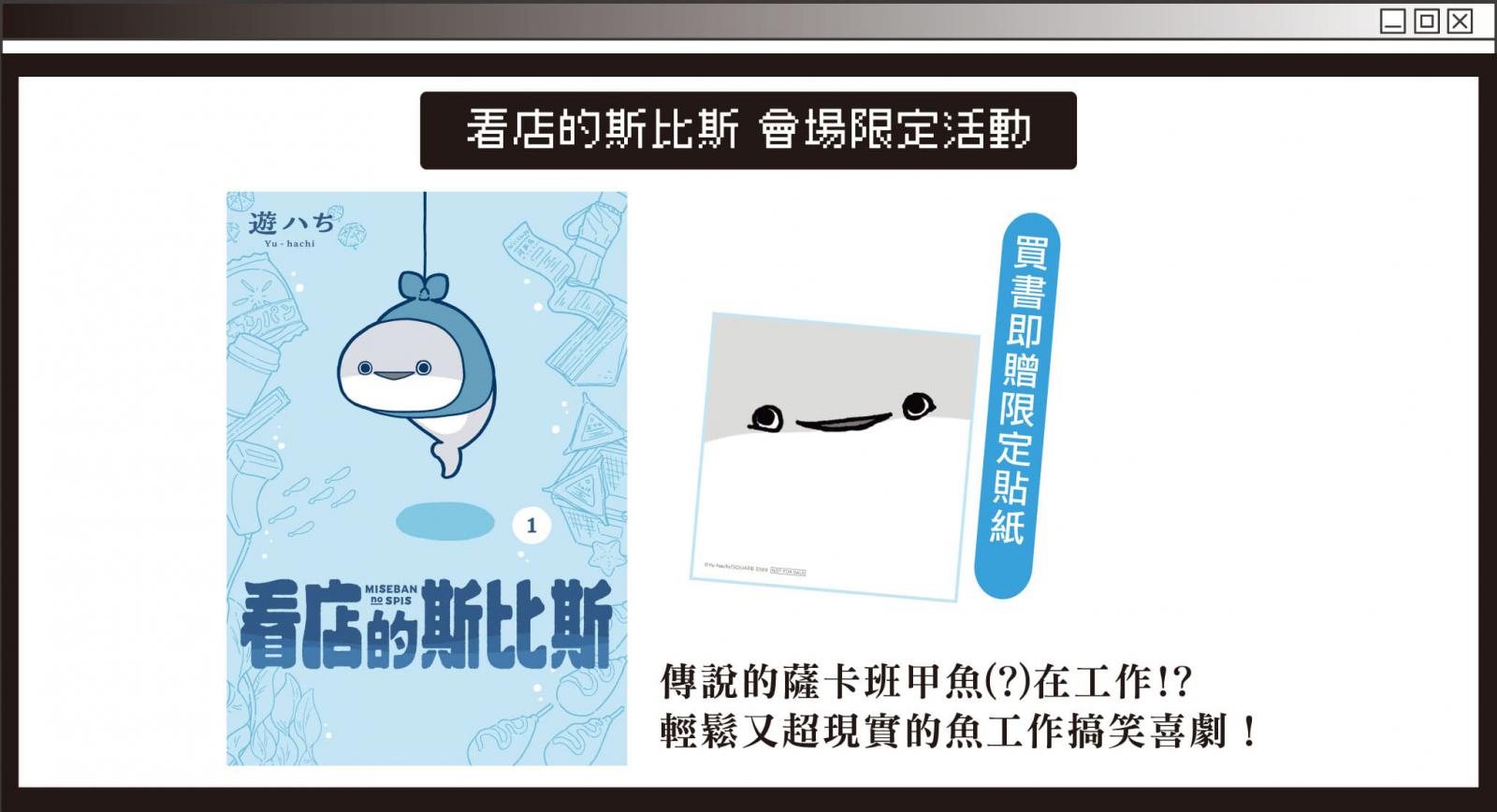 超級療癒、可愛的神祕魚也會在這次的高雄動漫節跟大家見面喲!只要買一本《看店的斯比斯(1)》就會送10×10cm的大張斯比斯貼紙乙份,買越多本送多張,可愛大臉貼紙等你來領取!