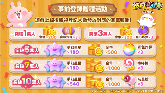 目前繁中版已正式開放事前登錄,即日起於官方網站及各大應用程式商店開放,參加登錄的玩家有機會獲得豪華好禮,1萬人即可獲得金幣與破關道具,達10萬人更可以獲得540個夢幻星星、1,000個金幣與破關道具。喜歡《卡娜赫拉的小動物》或消除類休閒遊戲的粉絲千萬不要錯過,快來登記入住,一起開啟豪華飯店的療癒旅程吧!