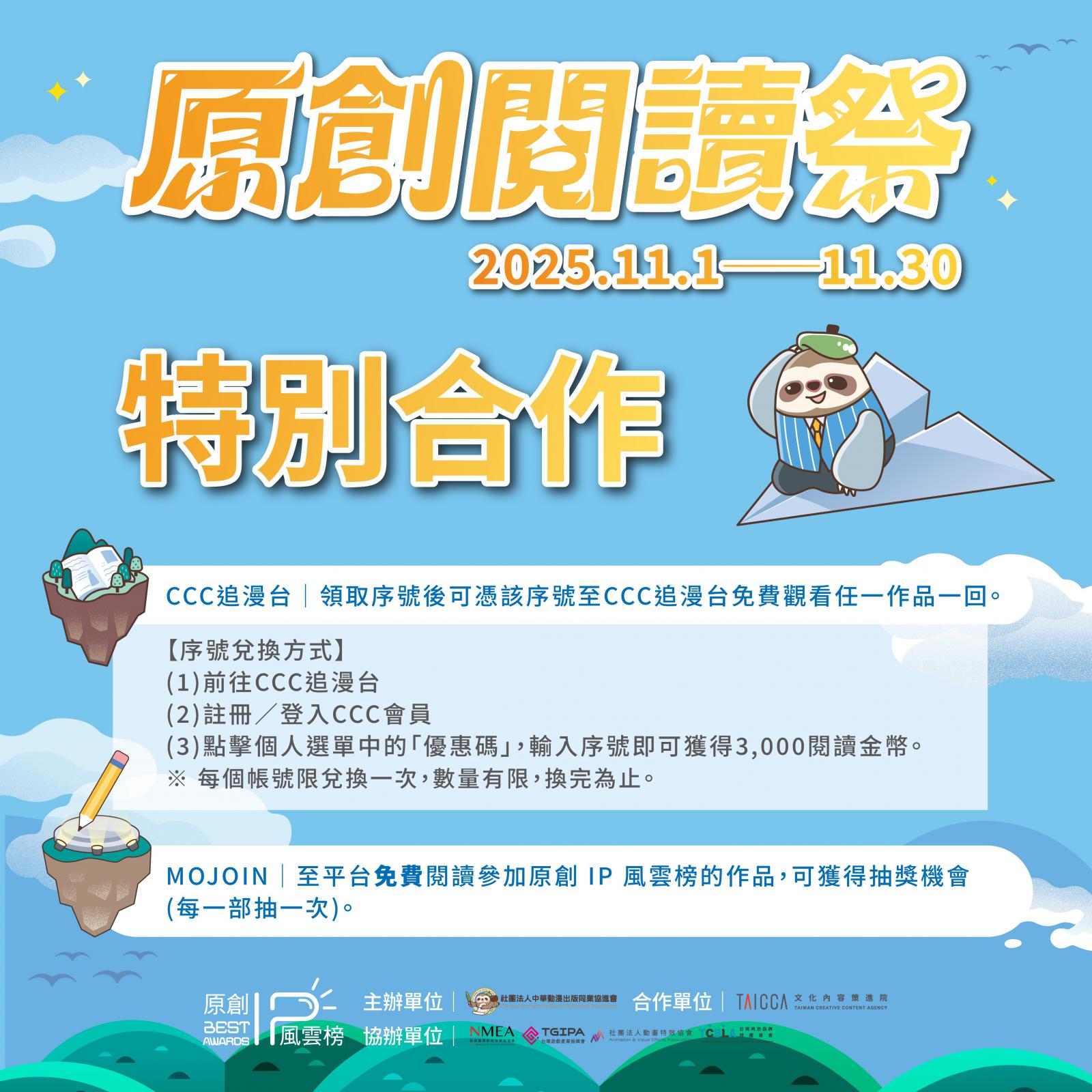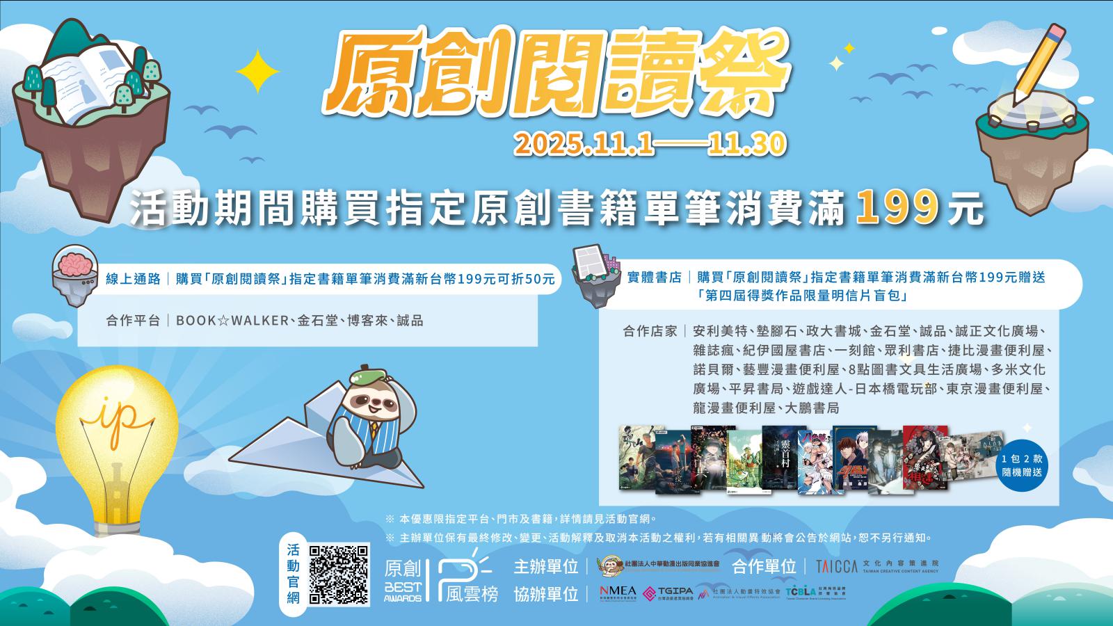 由社團法人中華動漫出版同業協進會主辦的「第四屆原創IP風雲榜」年度系列活動——【原創閱讀祭】,自11月1日至11月30日熱鬧展開。活動結合線上與線下多元通路,讓讀者在支持台灣原創漫畫與小說的同時,也能享受實質購書優惠。