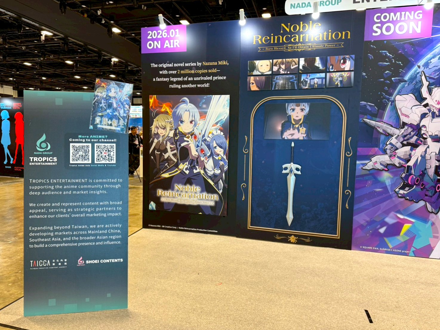 由文策院運用國發基金與智寶合資成立的翔英融創推出的全新動畫作品《貴族轉生~得天眷顧 一出生就獲得最強力量~》,於 11 月 28 日至 11 月 30 日在東南亞最大型動漫展會新加坡 AFA(Anime Festival Asia)首次亮相即獲得空前成功。展期三日吸引大量海外粉絲與業界人士參與,從展區布置、武器模型首次公開到動畫首話的世界先行放映皆引發熱烈討論。更獲得包括 Crunchyroll 在內的多個全球指標性平台採購,顯示作品具備強大的國際吸引力,也為 2026 年 1 月的全球正式開播奠定絕佳基礎。