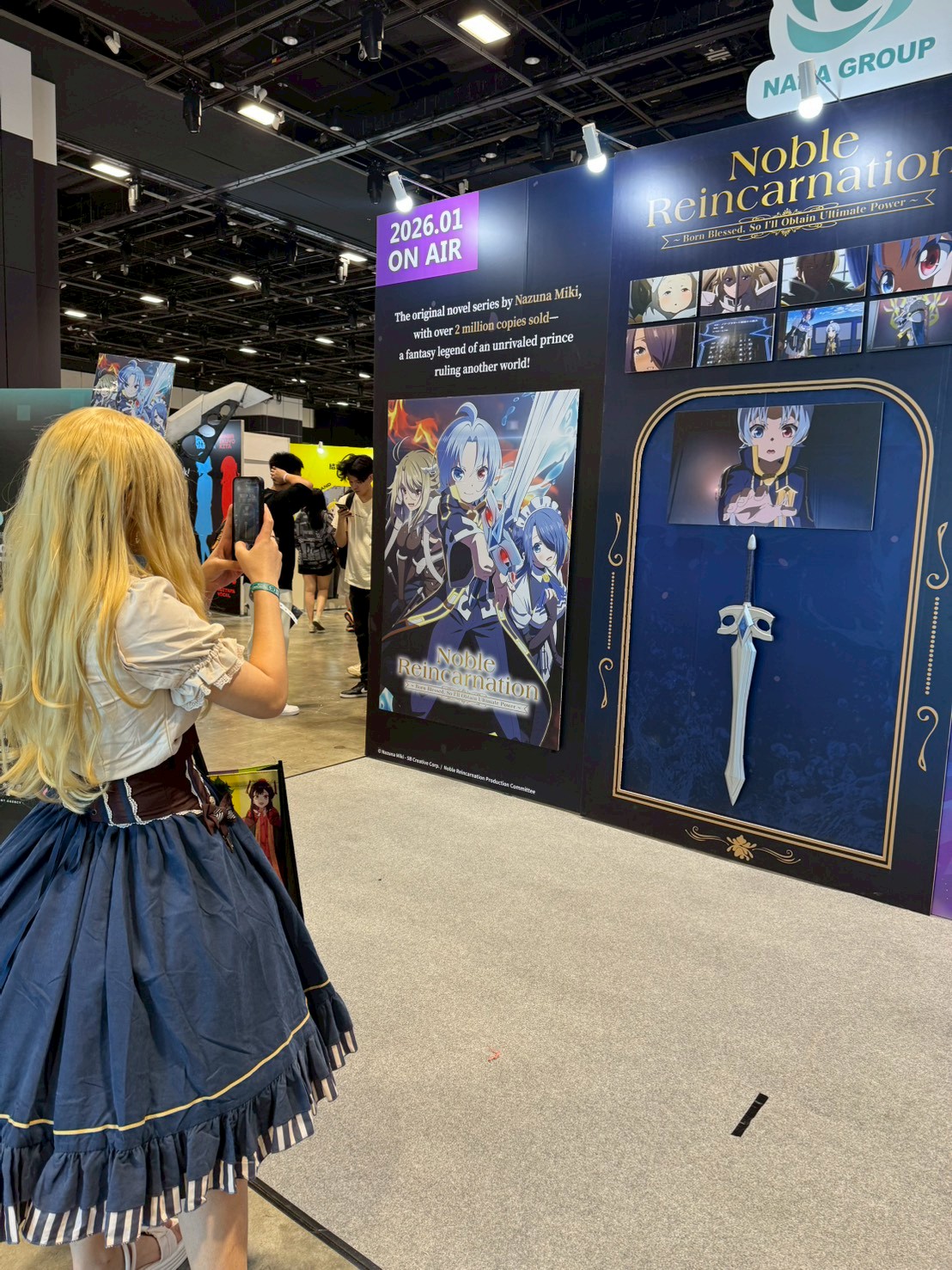 本次 Anime Festival Asia 活動於新加坡 Suntec City Convention & Exhibition Centre 盛大舉行,《貴族轉生~得天眷顧 一出生就獲得最強力量~》官方特別規劃專屬展區,展出精心打造的動畫視覺,以及動畫中武器的 1:1 還原模型,吸引了觀眾排隊拍照留念,成為展場中討論度極高的亮點之一。此外,官方亦在 11 月 28 日舉辦動畫第一集的世界先行上映,並特別帶來台灣原作者三木奈沙老師的創作訪談影片與主要聲優的專訪影像,讓海外觀眾得以首次完整了解作品背後的製作理念。許多觀眾在觀賞後紛紛表達對角色魅力、故事節奏與戰鬥畫面的高度好評,詢問開播日期的回饋更是絡繹不絕。