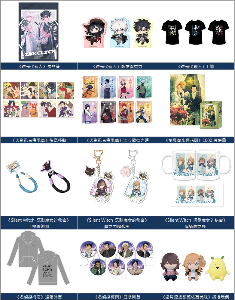 風靡亞洲的人氣動畫《時光代理人》以美型人物設定及懸疑劇情著稱,喜愛這部作品的朋友們,一定不能以錯過主角三人組和人氣角色設計的各項周邊商品,包含長門簾、T恤、大滑鼠墊、壓克力場景組、冷燙色紙等,既實用又好看,更有超過100項原廠周邊來台,數量有限先買先贏!讓人熱血沸騰的經典王道大作《火影忍者疾風傳》也將帶來各式日版公仔模型及絨毛玩偶,各項熱門商品同步追加到貨,總計超過200項豐富周邊,「火影」粉絲不用到處跑,來「曼迪動漫狂歡祭」一次搜齊!