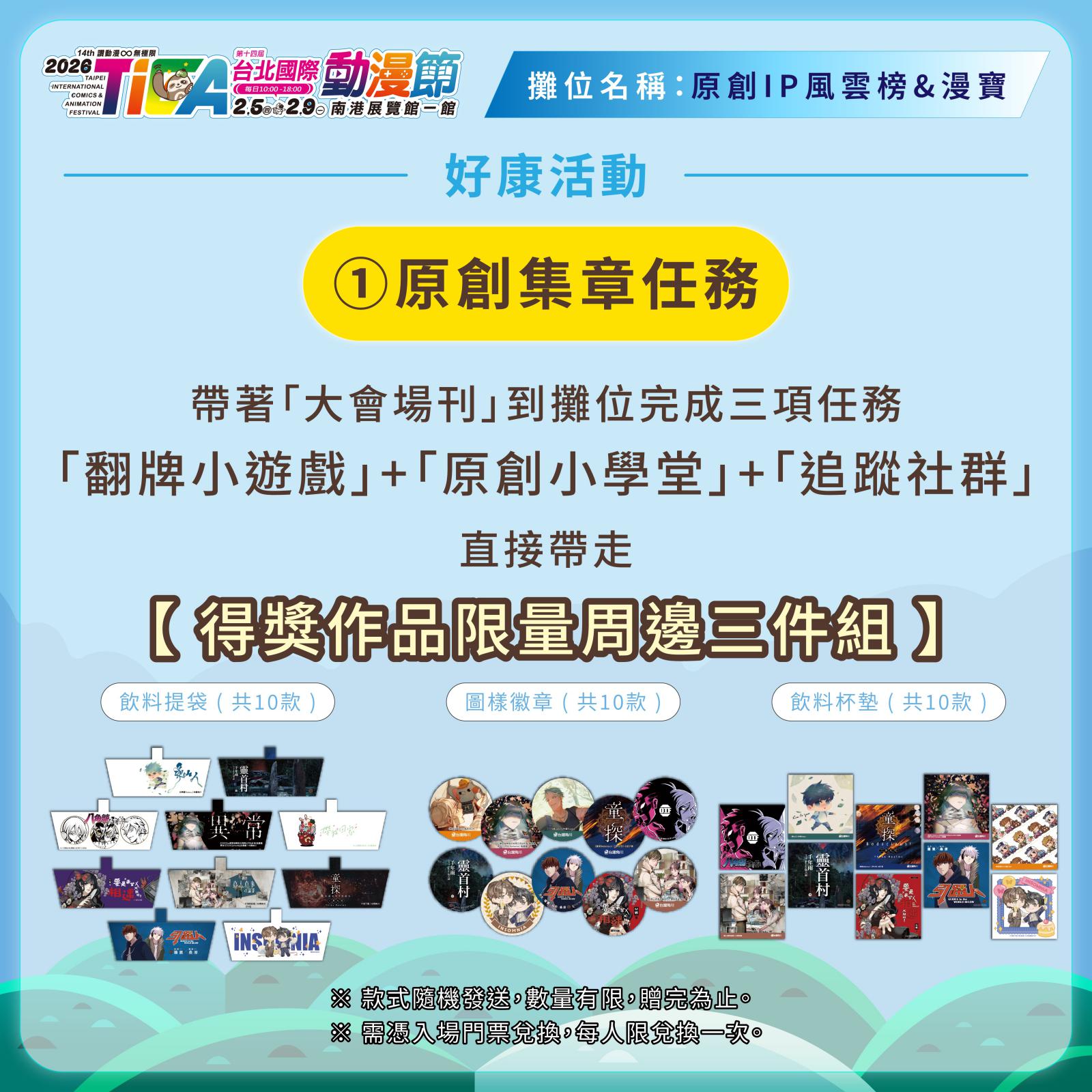 - 新春試手氣:拍照打卡刮好禮!配合農曆年節氣氛,攤位特別舉辦「新春抽好禮」活動。民眾只要拍下攤位上的書籍或遊戲,上傳社群打卡並標註 #原創IP風雲榜,即可獲得刮刮樂乙張。獎項包含限量漫寶周邊及新春紅包袋,張張有獎,歡迎大家來試試手氣。