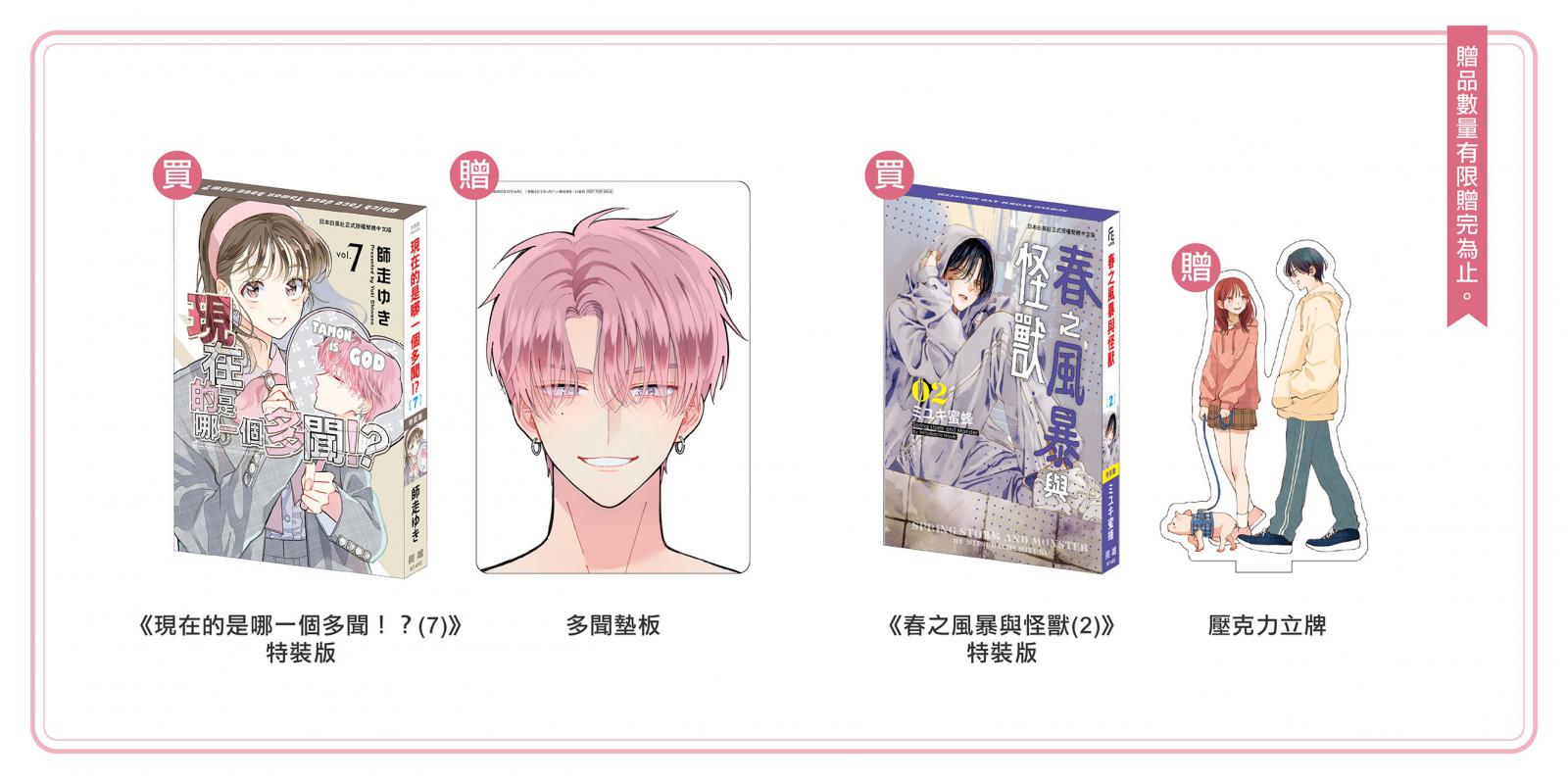 動漫節會場限定特典活動——現場購買《現在的是哪一個多聞!?(7)》特裝版乙件,即可獲得限量「多聞墊板」乙個。於官網或長鴻攤位現場購買《春之風暴與怪獸(2)》特裝版則贈送同作品的「壓克力立牌」乙組。以上日本月刊限定贈品皆不可累贈,數量有限送完為止,請各位粉絲把握時間前往購買書籍!