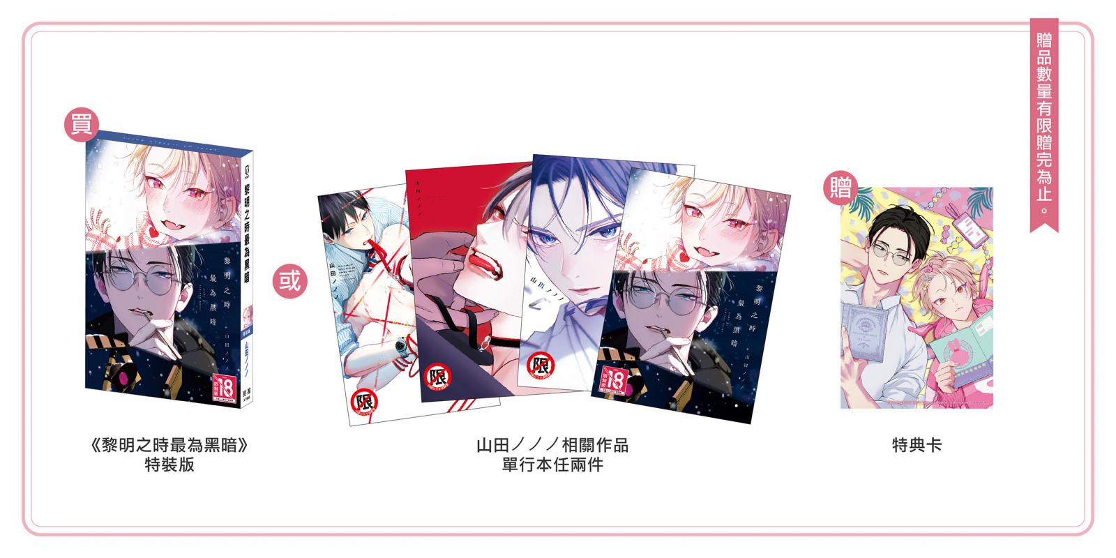 另外於動漫節現場購買《黎明之時最為黑暗》特裝版或作者山田ノノノ老師相關單行本任2本,即贈送「限定特典卡」乙張,特典卡可累贈,數量有限送完為止!